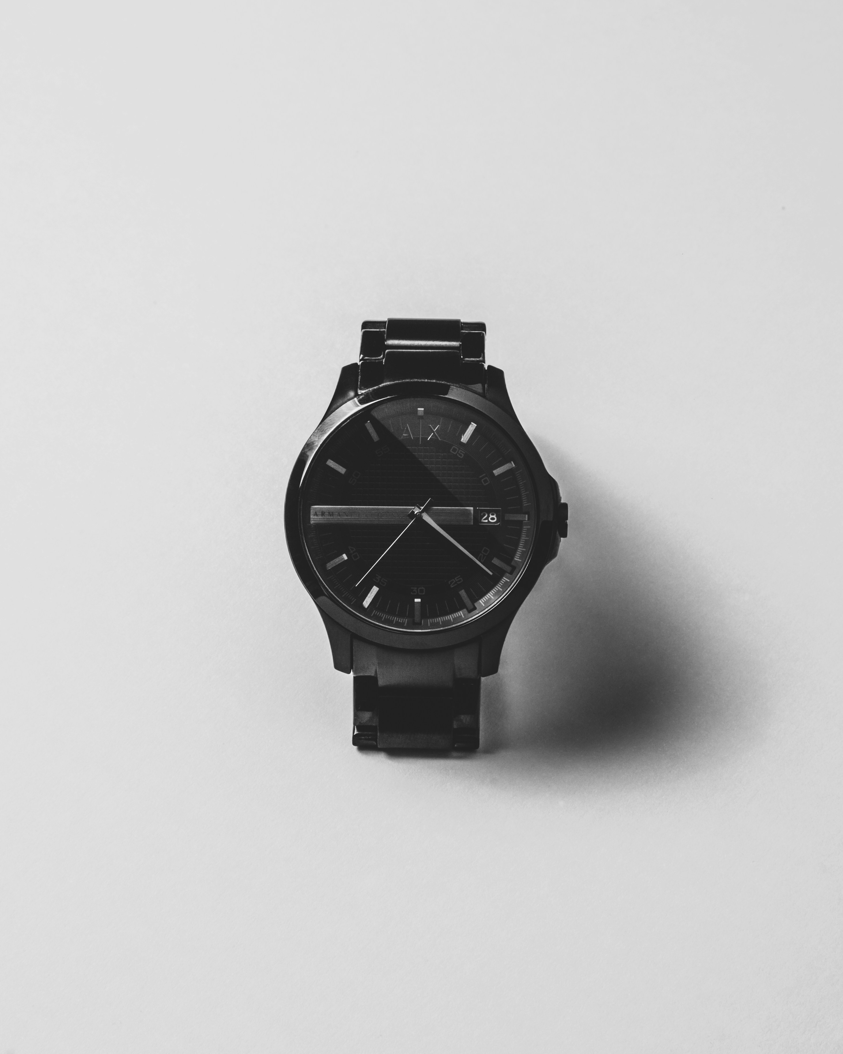 round black chronograph watch in case
