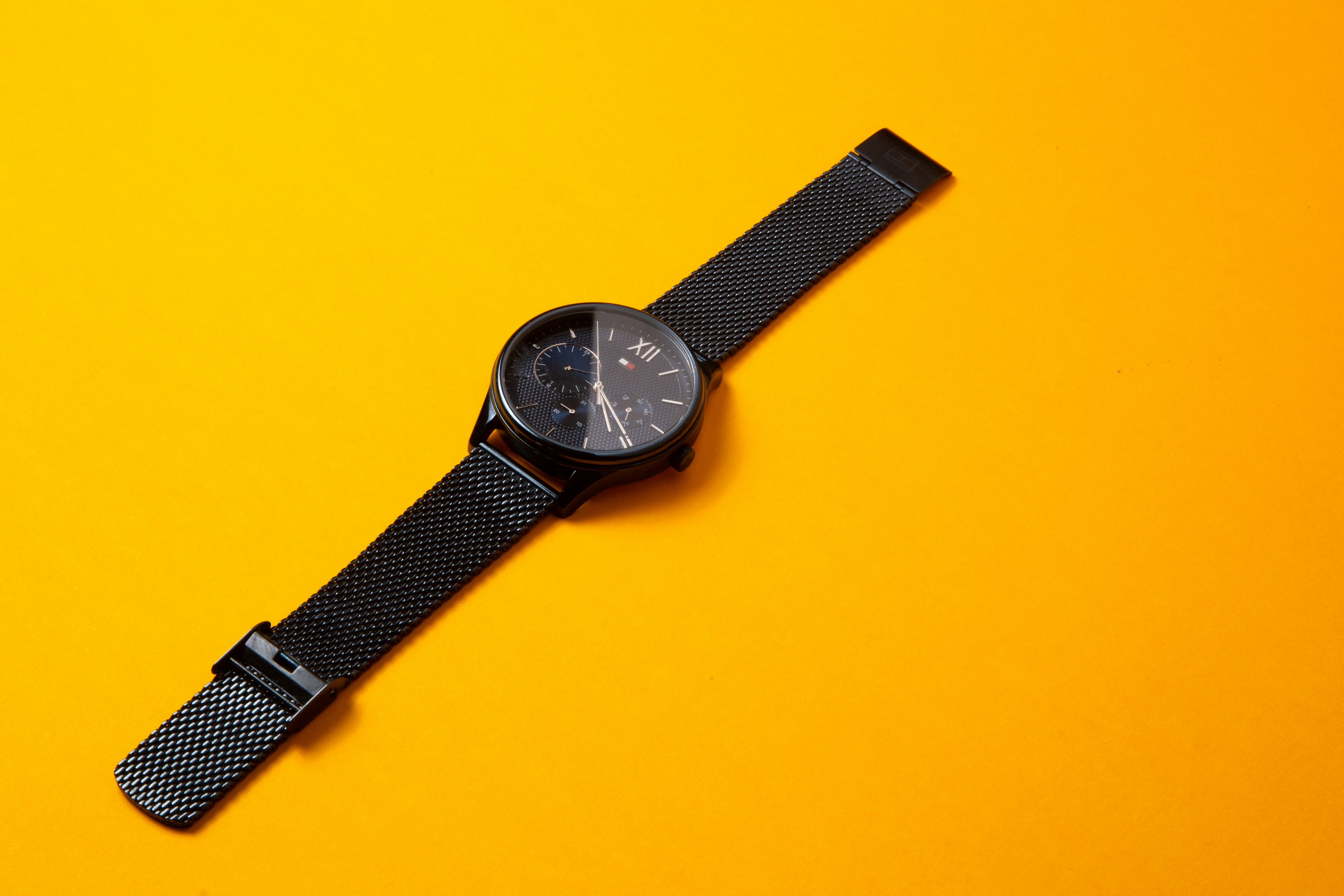 round black Tommy Hilfiger chronograph watch on black surface