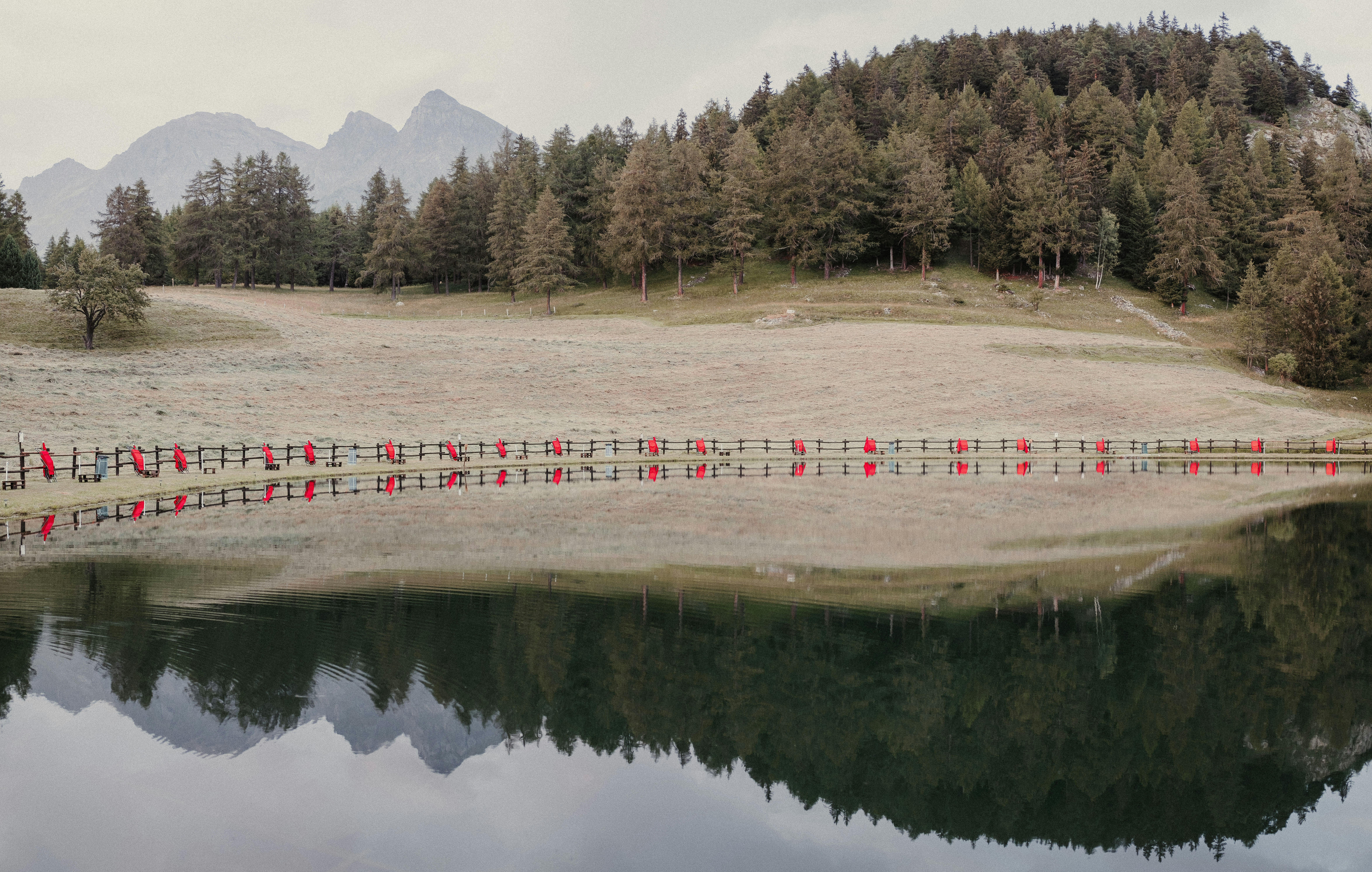a lake surrounded by trees and a fence