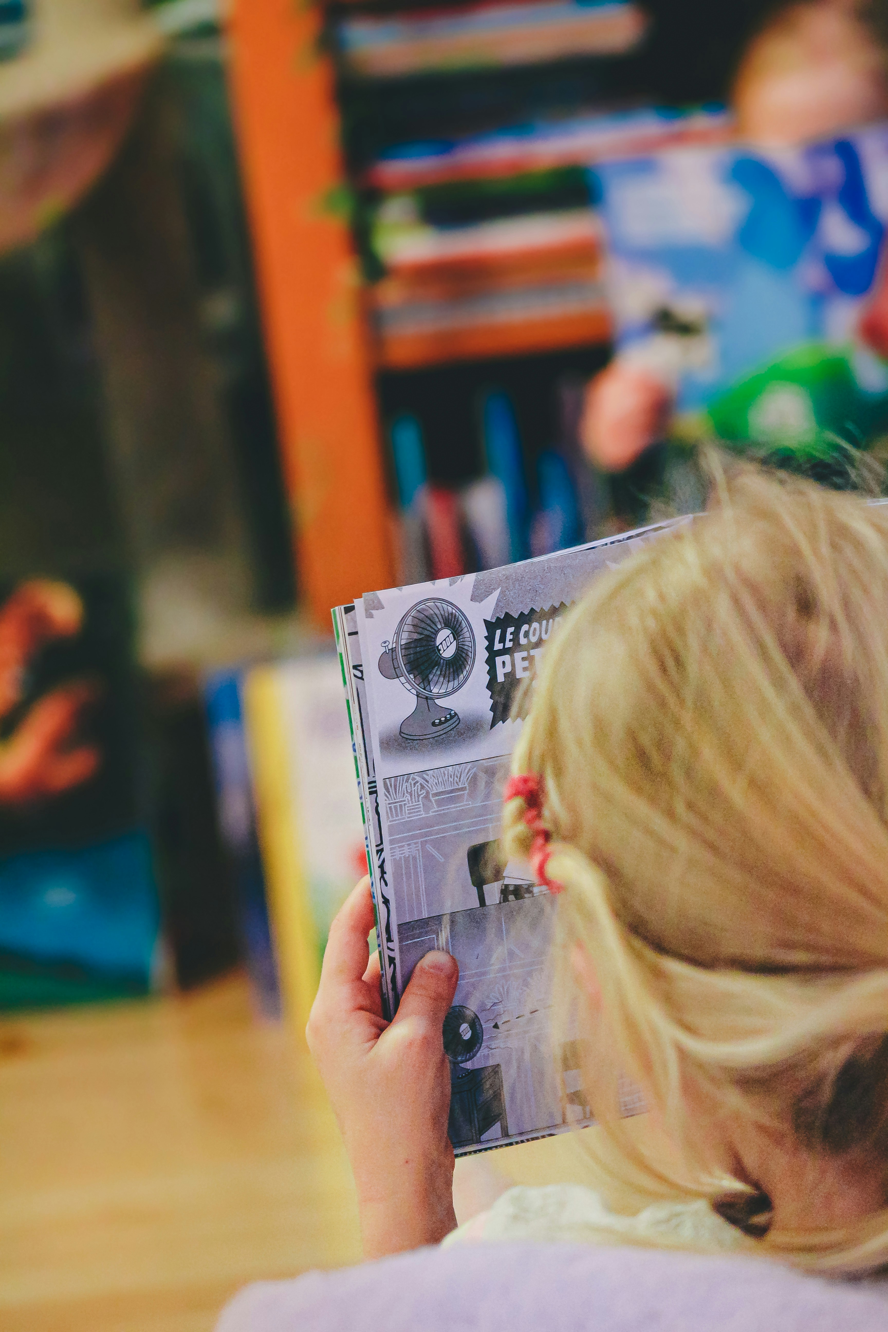Children reading books together on the floor.