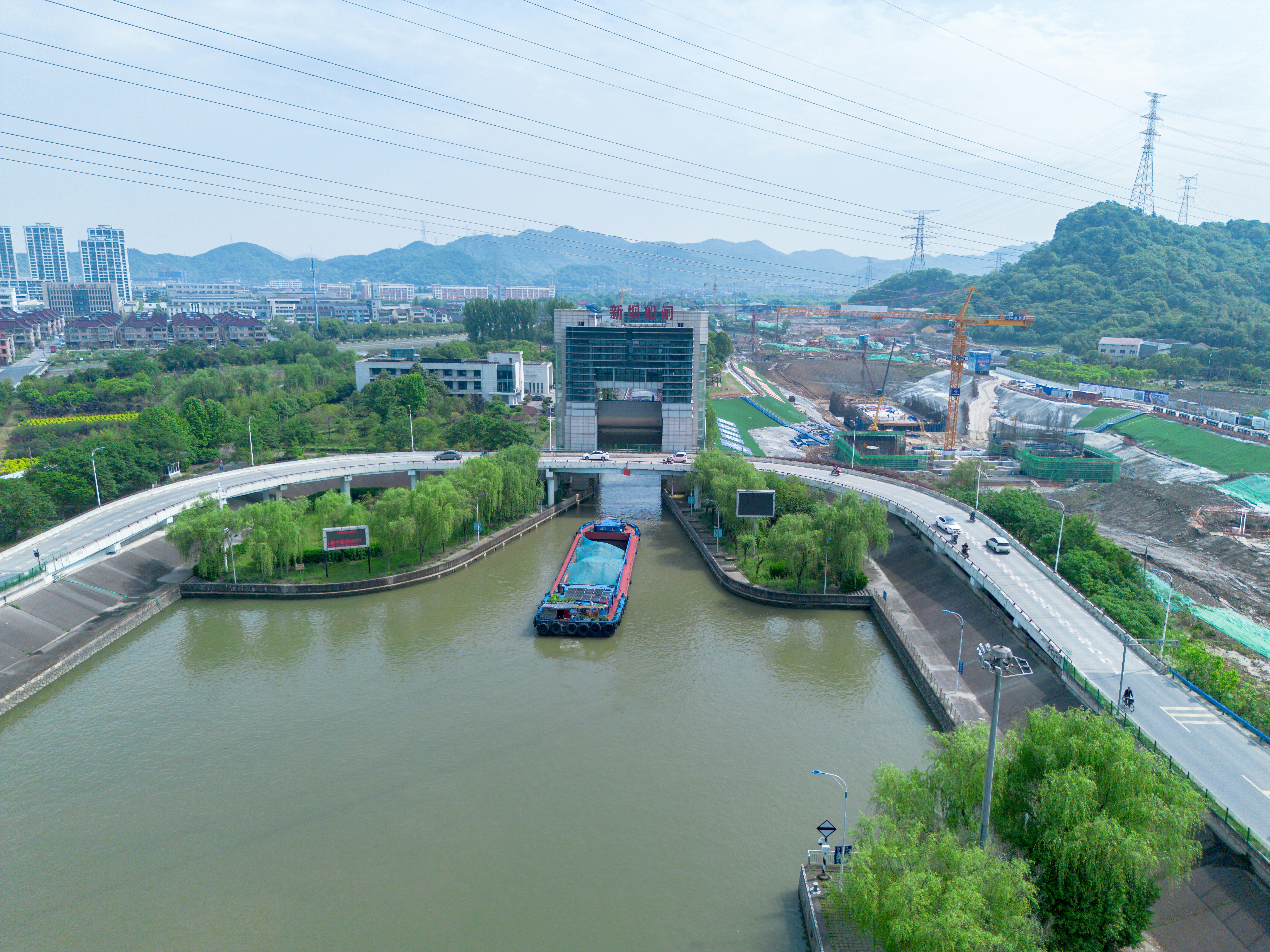 An aerial view of a city and a river
