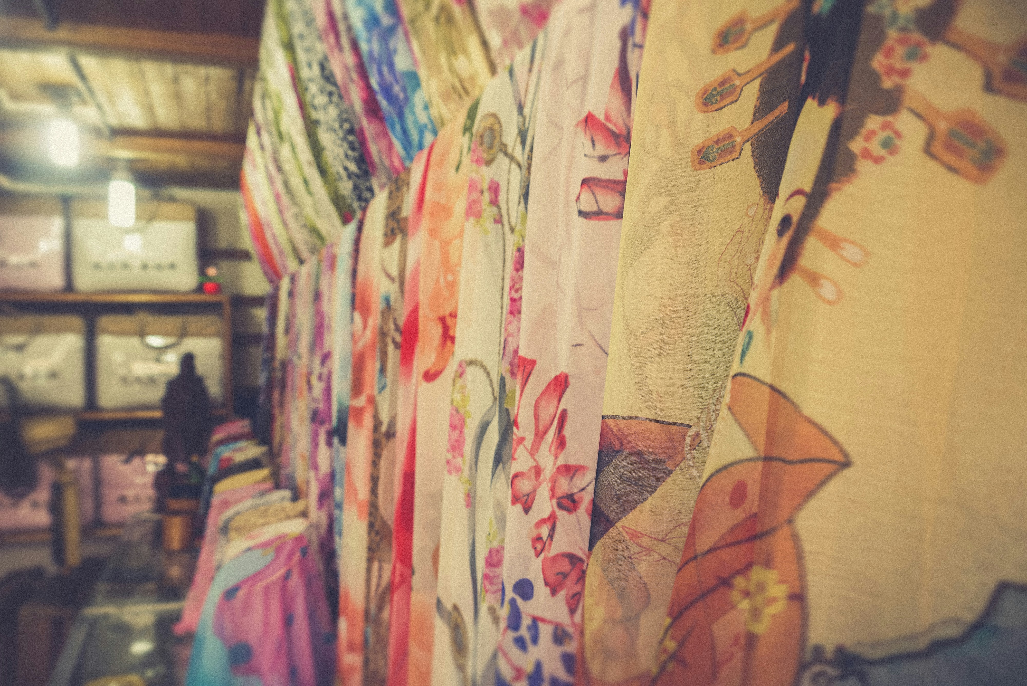 Frau in weißem Oberteil und orangefarbenem Rock geht in den Laden