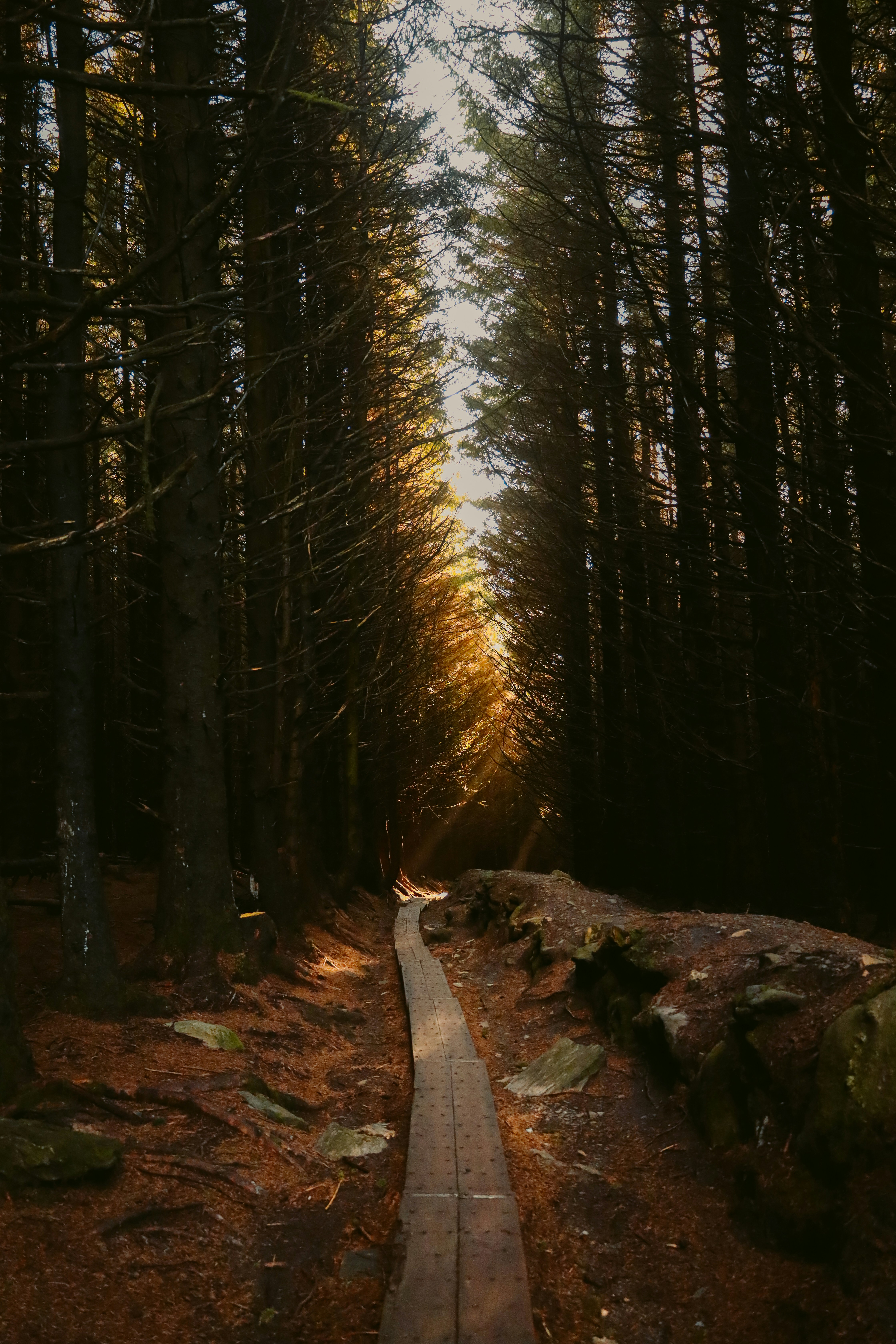 Ein Weg durch einen Nadelwald an klarem Tag
