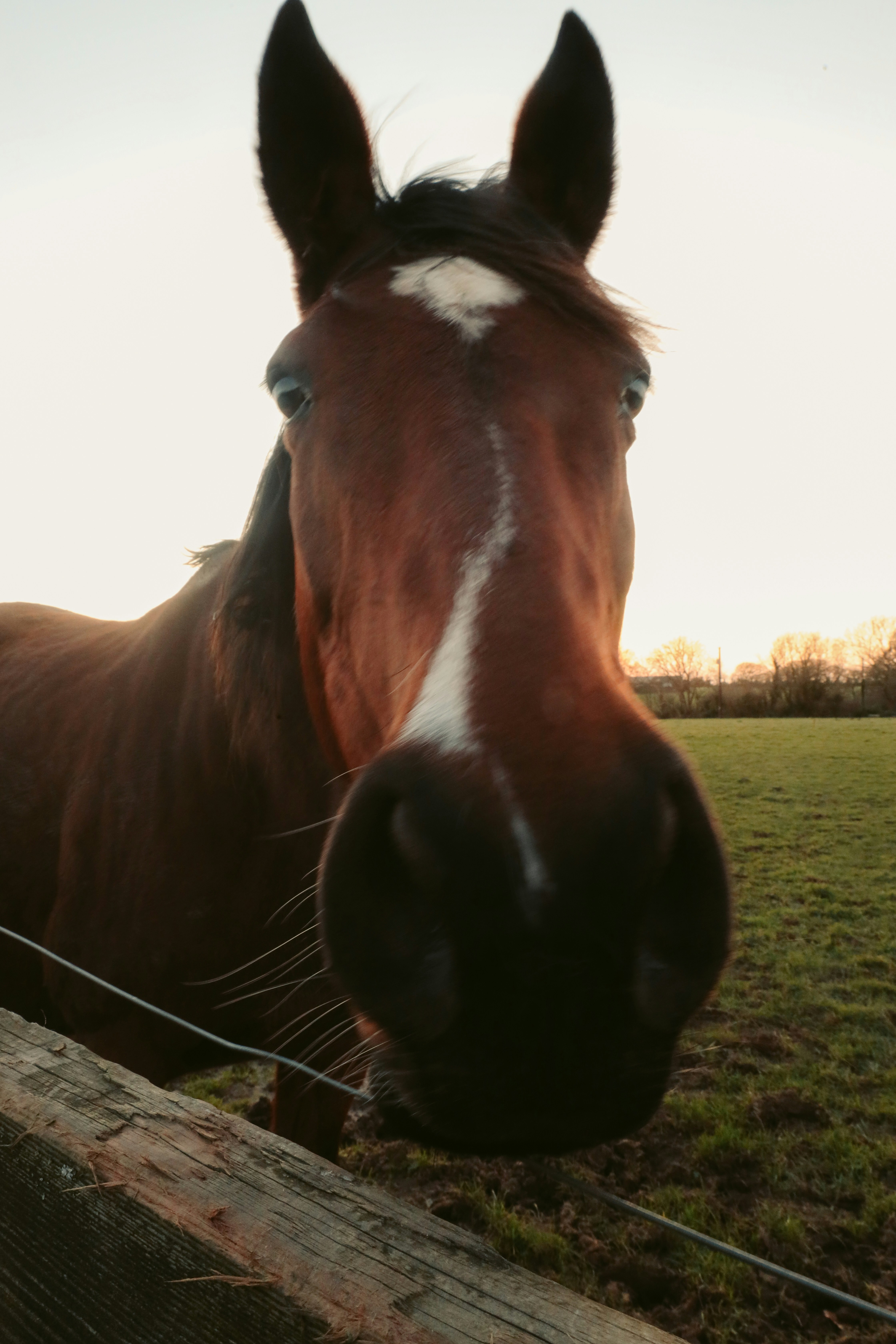 Ein braunes Pferd steht bei Sonnenuntergang hinter einem Zaun.