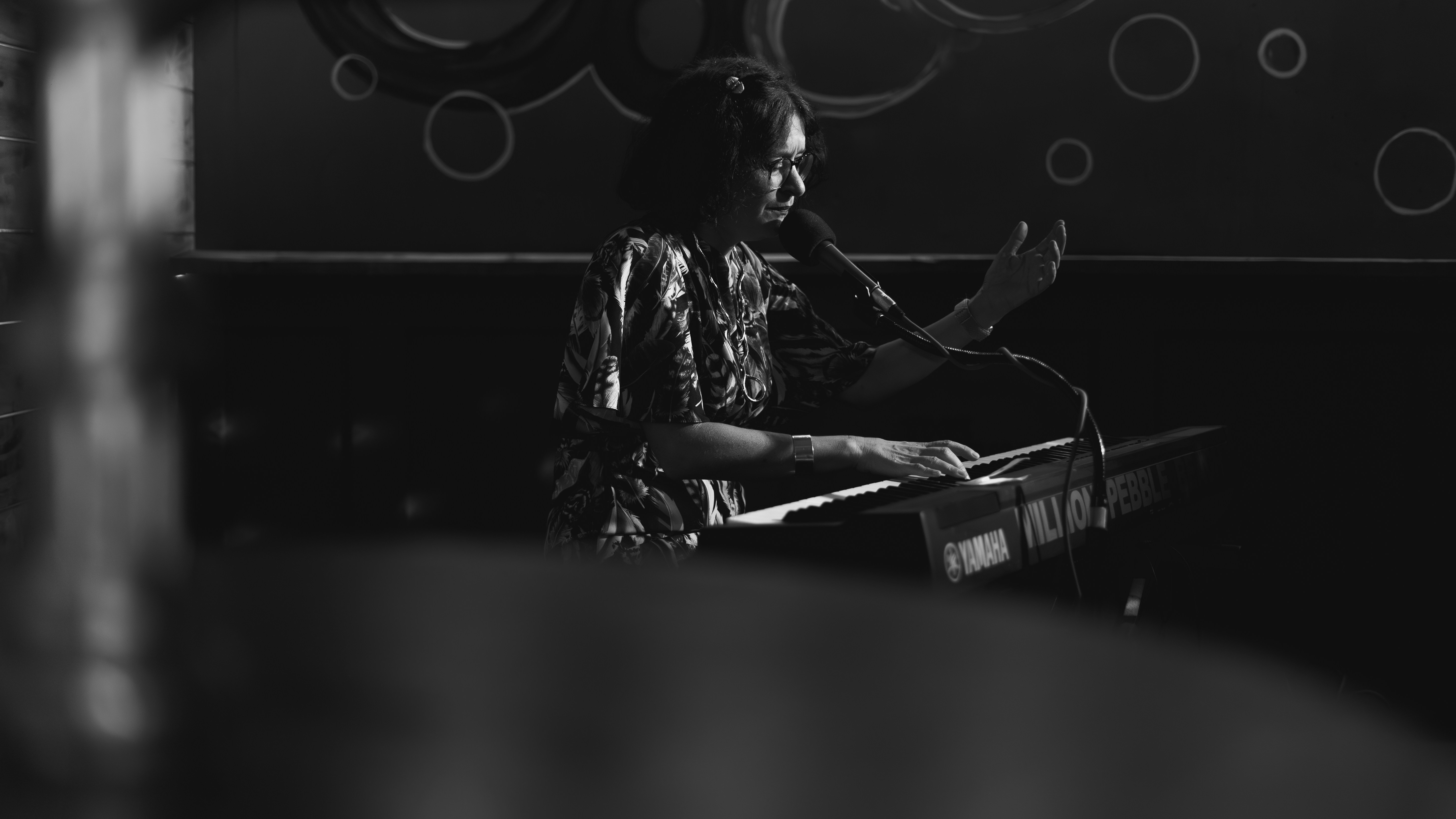 Eine Frau, die vor einem Mikrofon steht