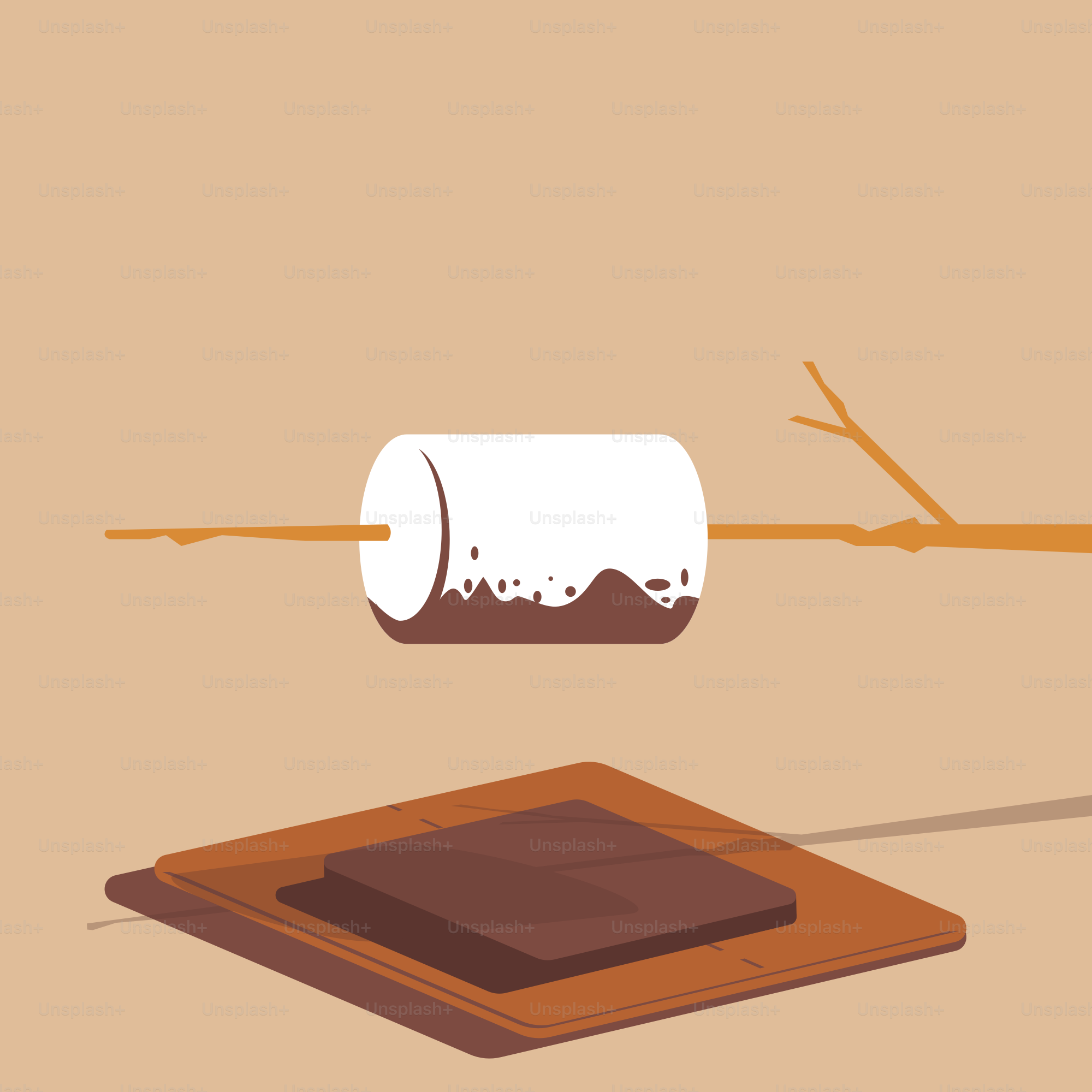 Autumn season illustration of a roasted marshmallow on a stick about to be placed on top of a graham cracker with a piece of chocolate to make a campfire s'more.