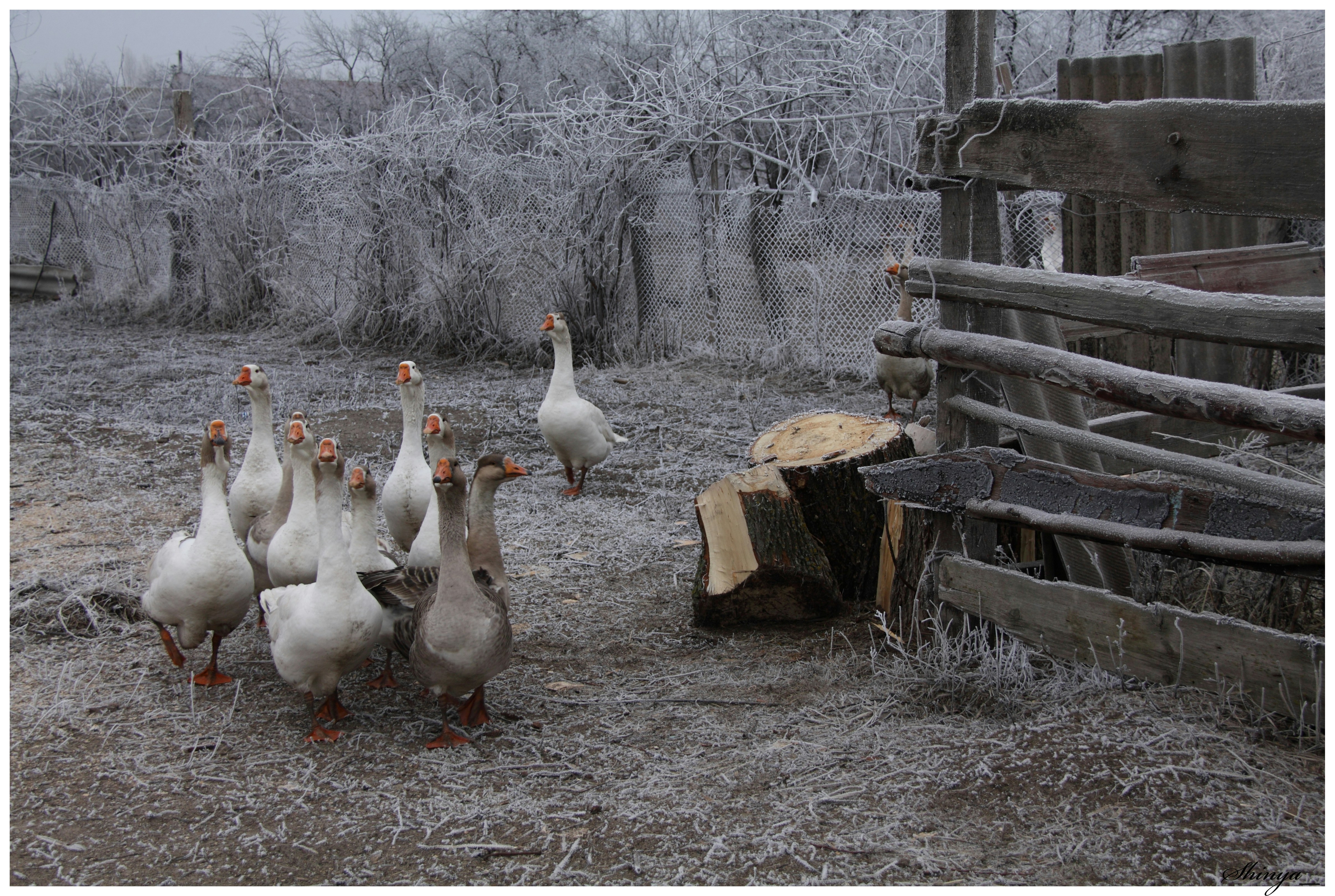 1 января мы отправились в лес подышать морозным воздухом. Дорога лежала через небольшую деревню. Совершенно неожиданно нам навстречу из-за угла деловито свернули гуси!