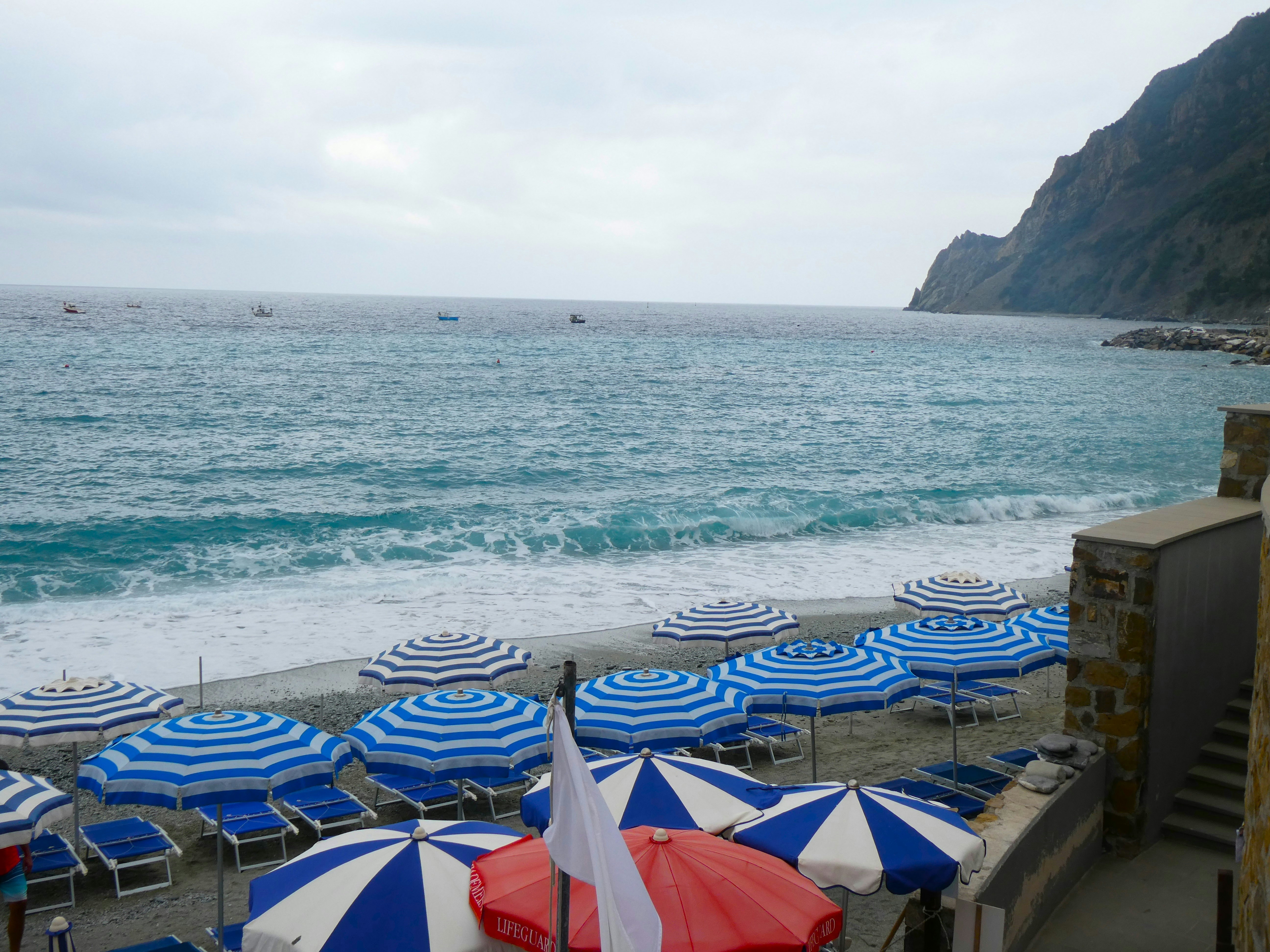 Colorful striped umbrellas in orderly array on the beach in Monterosso al Mare, Cinque Terre, Italy