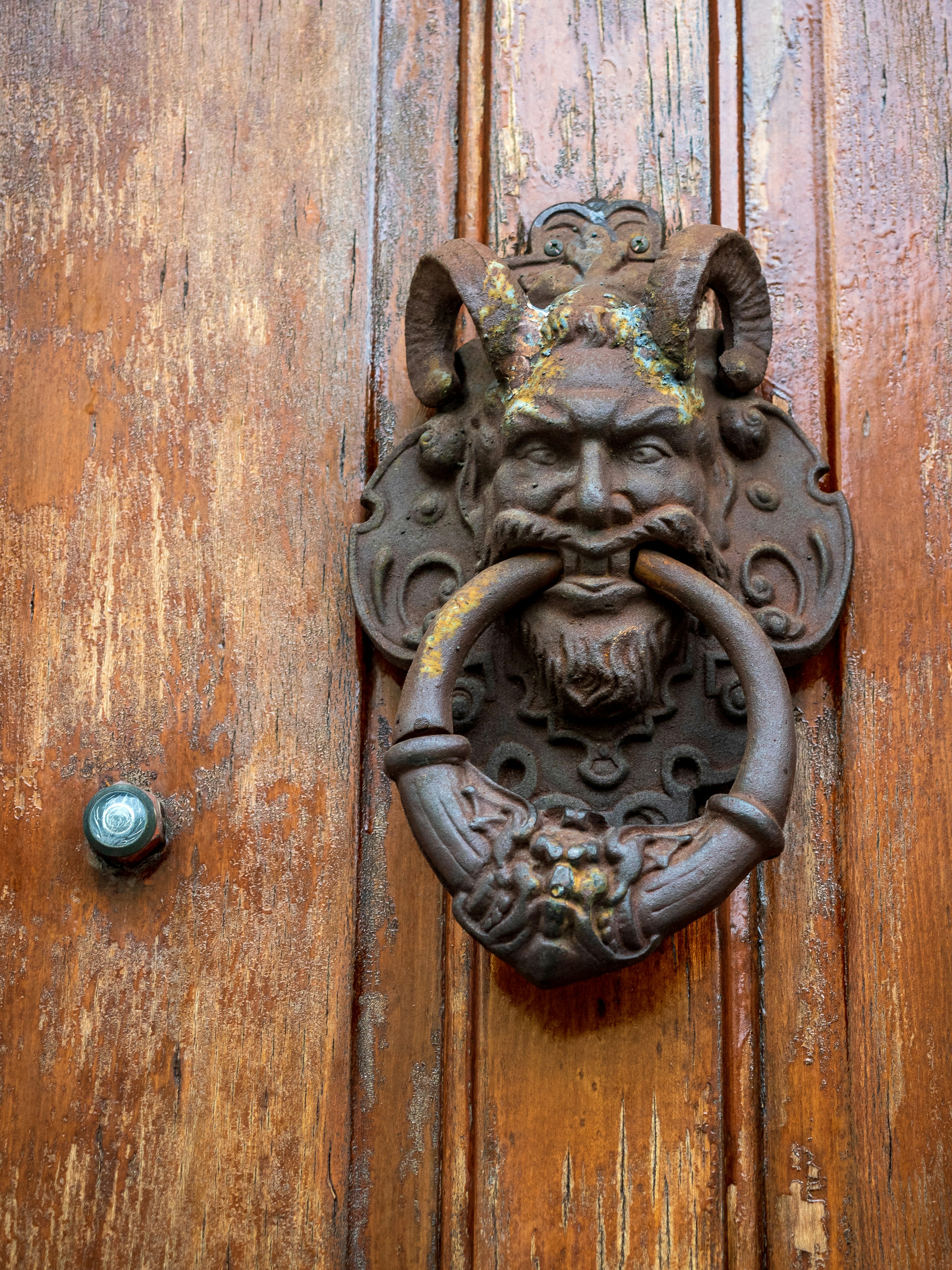 Satan door knocker on wood door