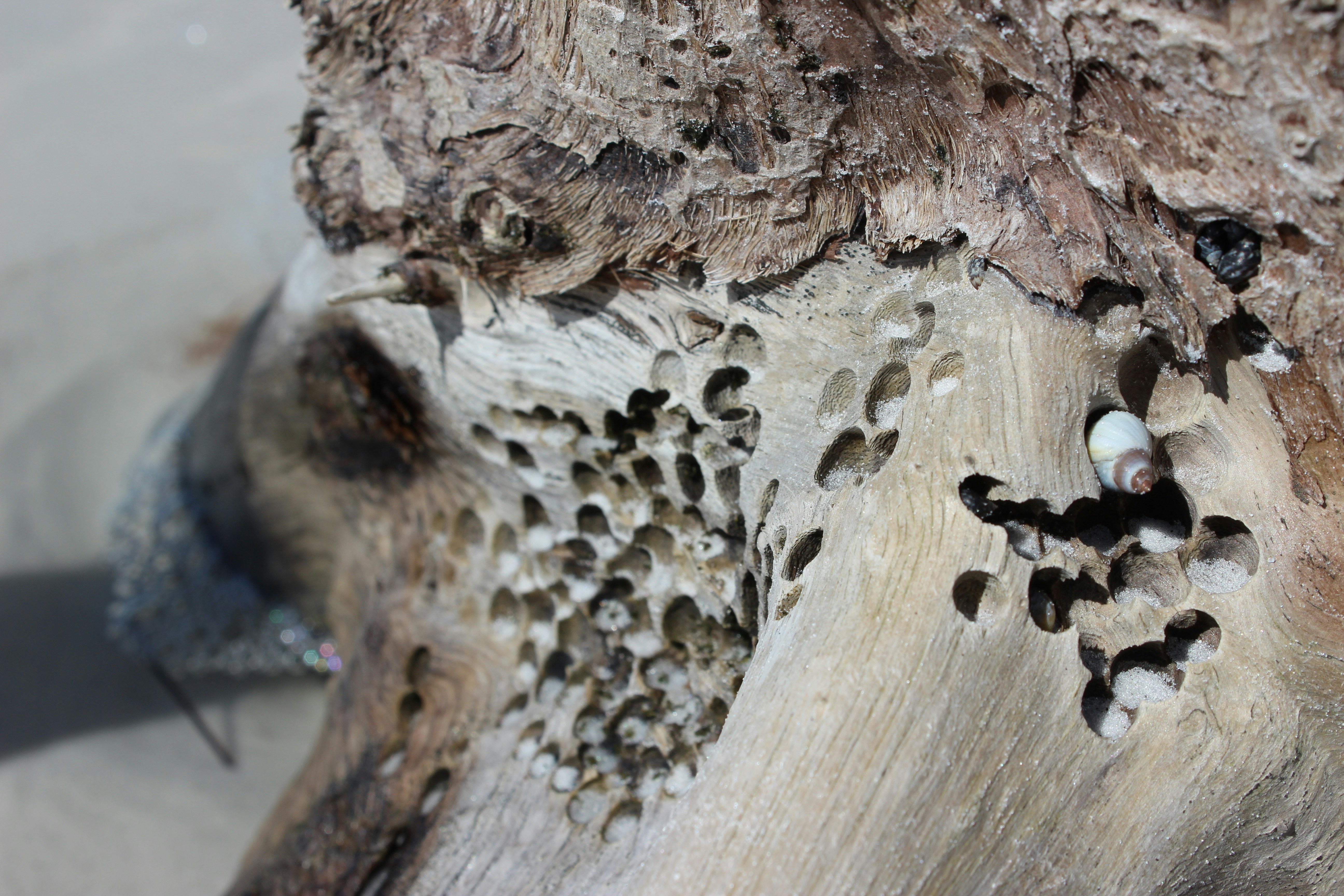 Walking on North Beach in Fort Desoto, St. Peterburg, Florida, I saw a lot of pieces of trees that had fallen or washed ashore. All were in various states of decay. I stopped to photograph this one because I thought the textures were particularlly interesting, then I noticed the shell.