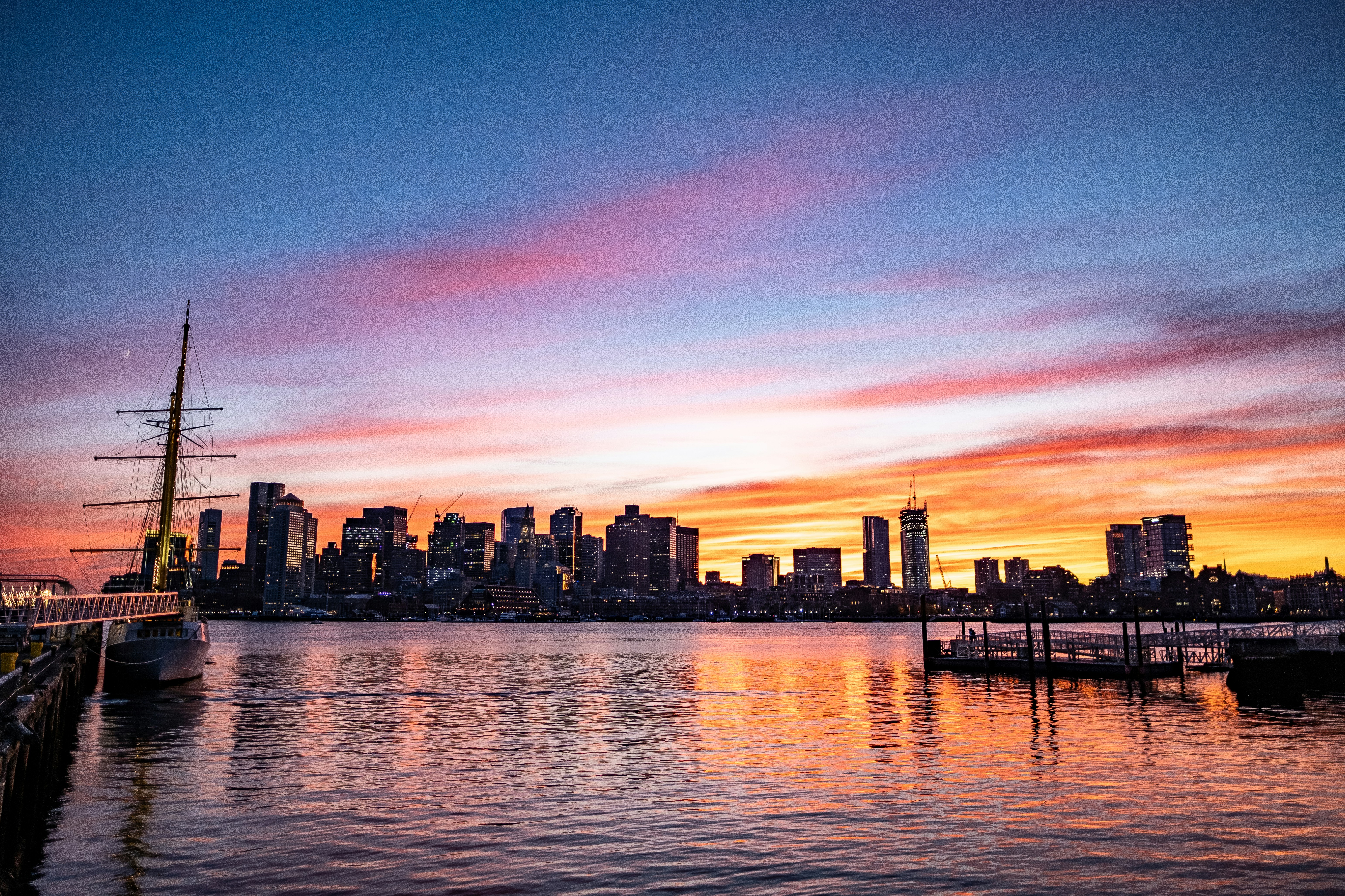 Boston skyline at sunset in the fall