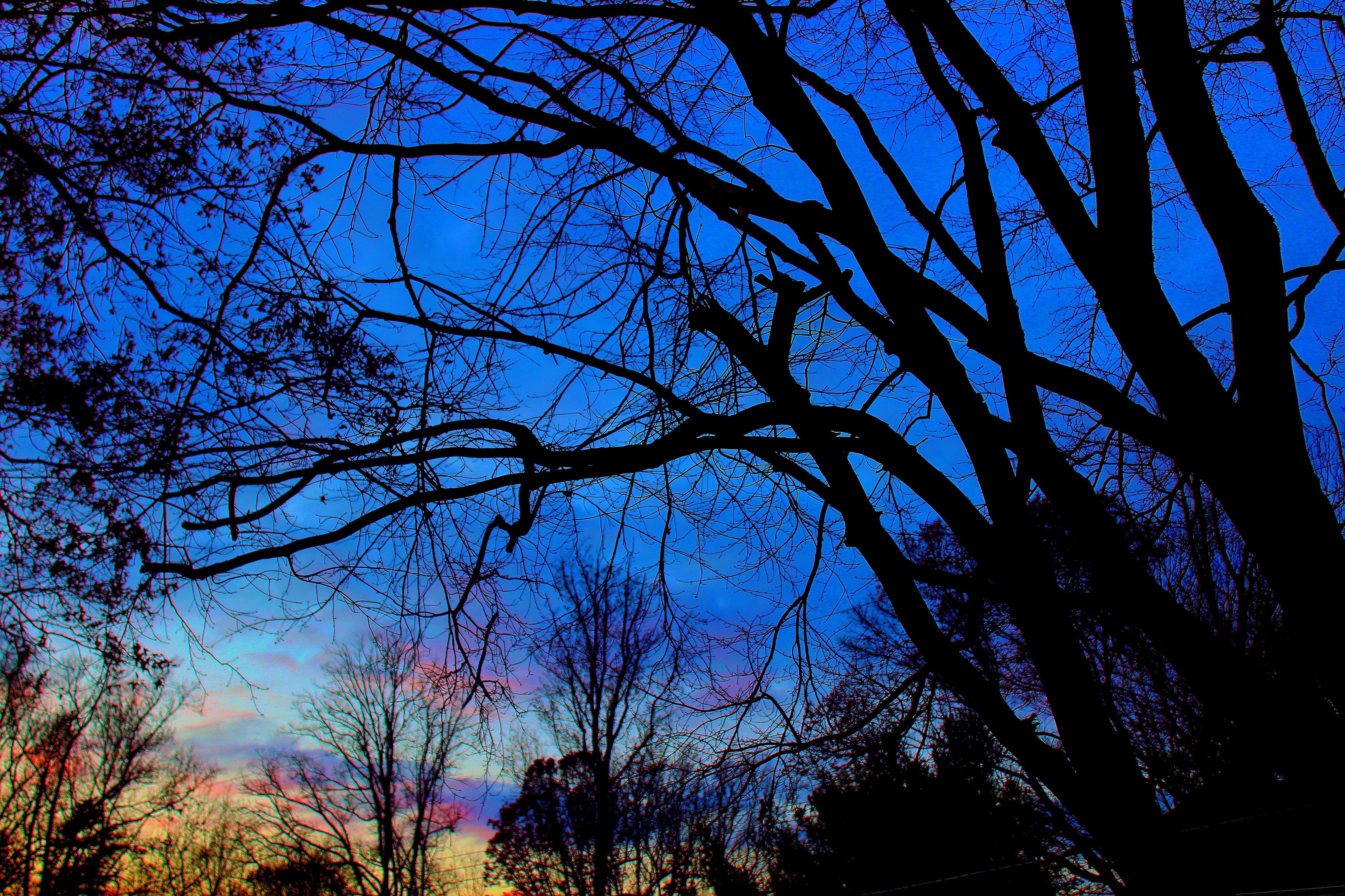 This is a picture of sunset though a forest of trees. It was in late fall after the maple tree in the foreground lost all its leaves. The tree to the far left of the photo is an oak tree and still has some leaves remaining.