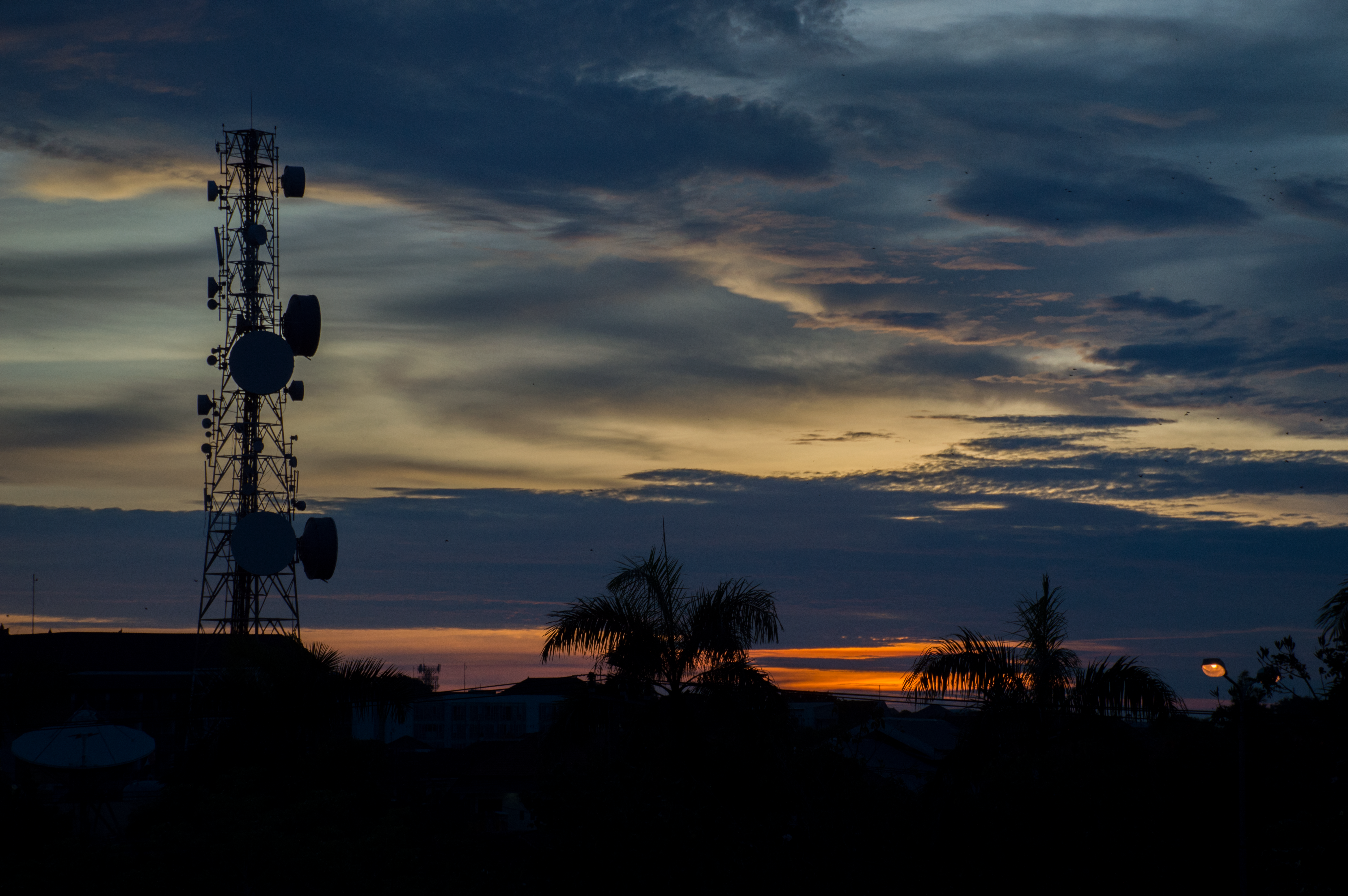 Waiting in car for the family to finish up holiday shopping in bali when the sun started to set through the view of palm trees, a beautiful sky and a communications tower.