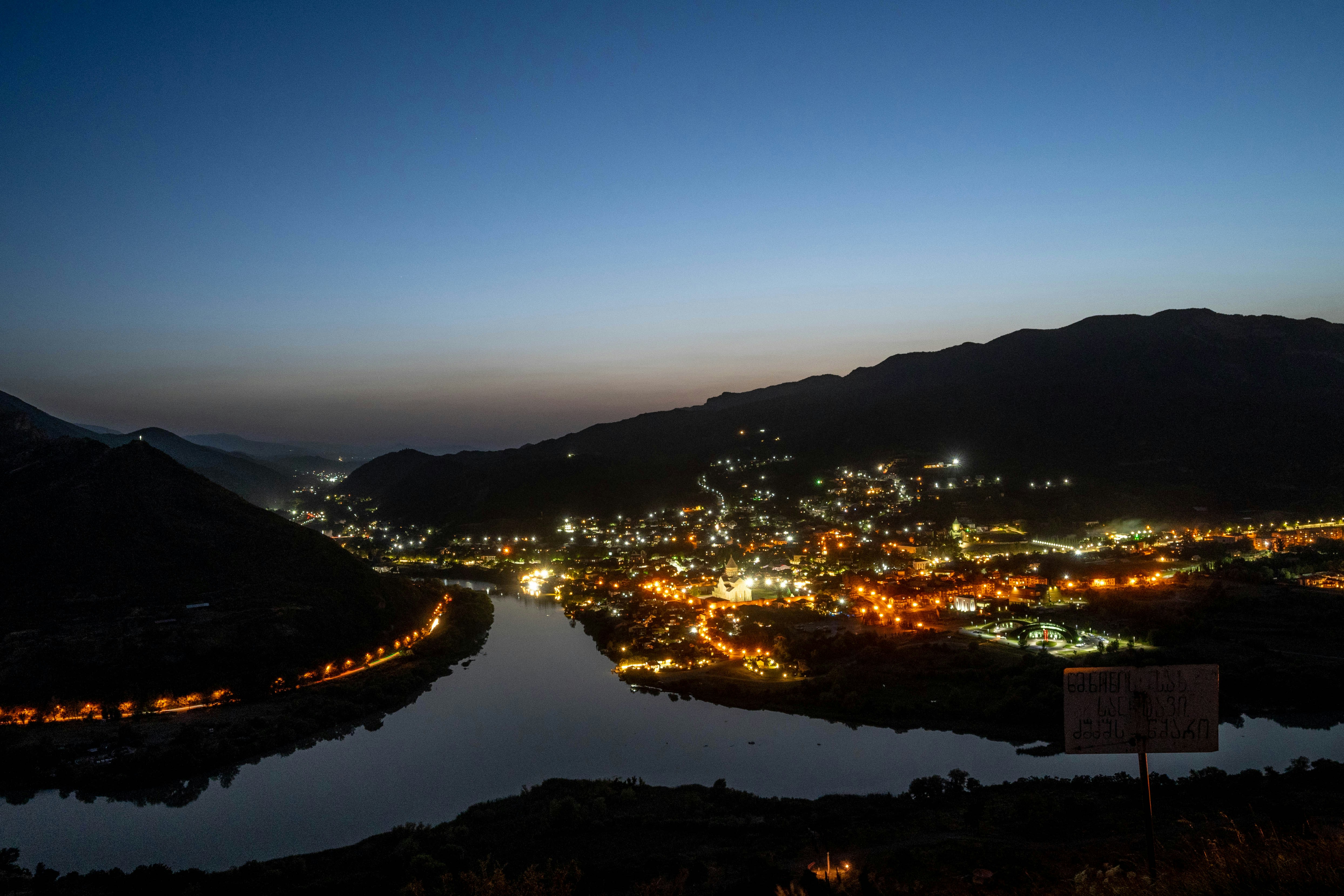 Evening view of Mtskheta village, located at the confluence of the Kura and Aragvi rivers, from the height of the Monastery of the Holy Cross.