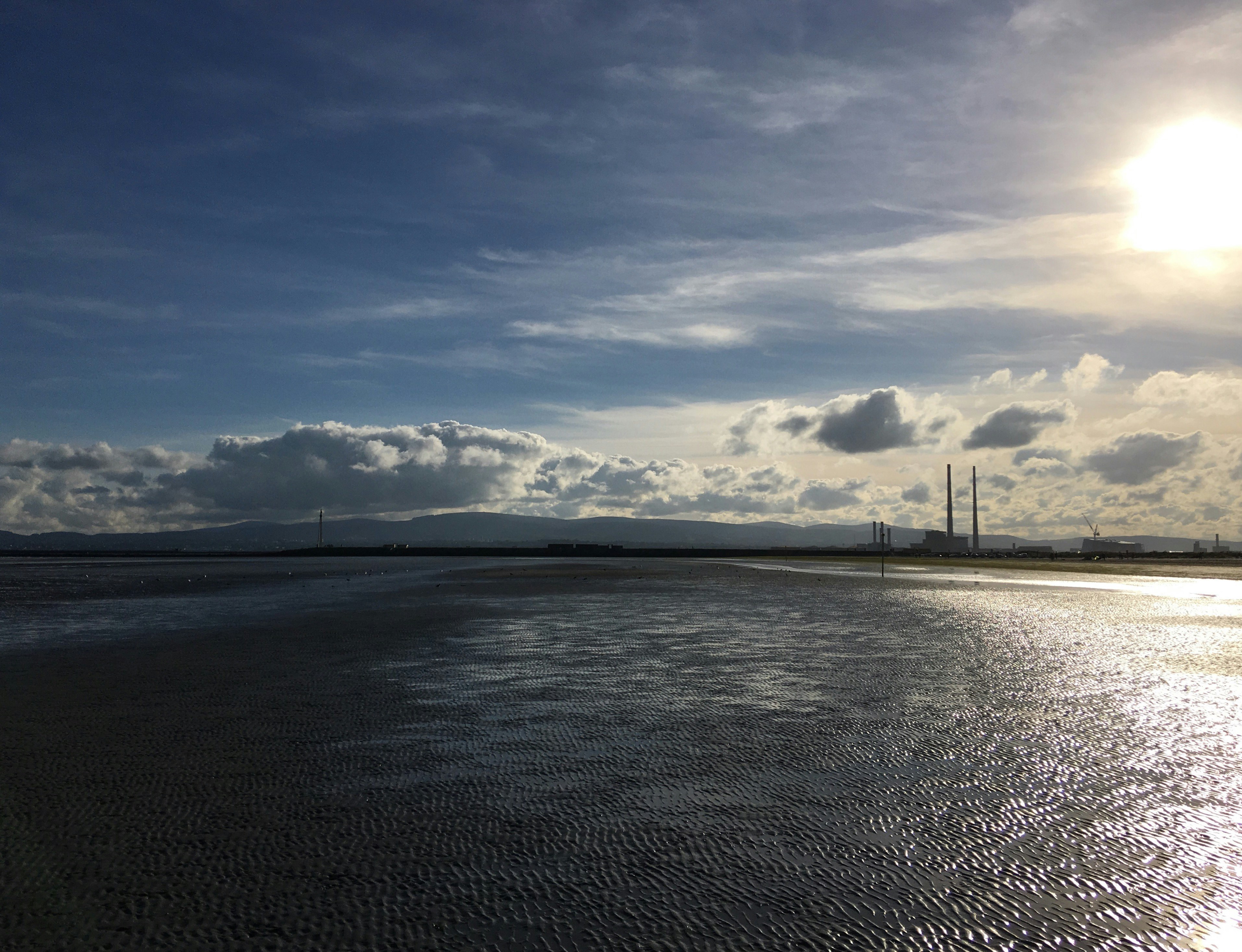 A beach called Dollymount near where we live in Dublin. Happened to be a cool but clear day, we went for a walk along the beach. This is on the way back on the walk, looking South towards what locals laughably call the Dublin Mountains, but which visitors can clearly see are nice “hills” :-) Dublin city is wrapped around Dublin Bay - a great resource used for sailing, swimming, kitesurfing, and more. I use this as a desktop screensaver on rotation. Always brings be right back to that walk.