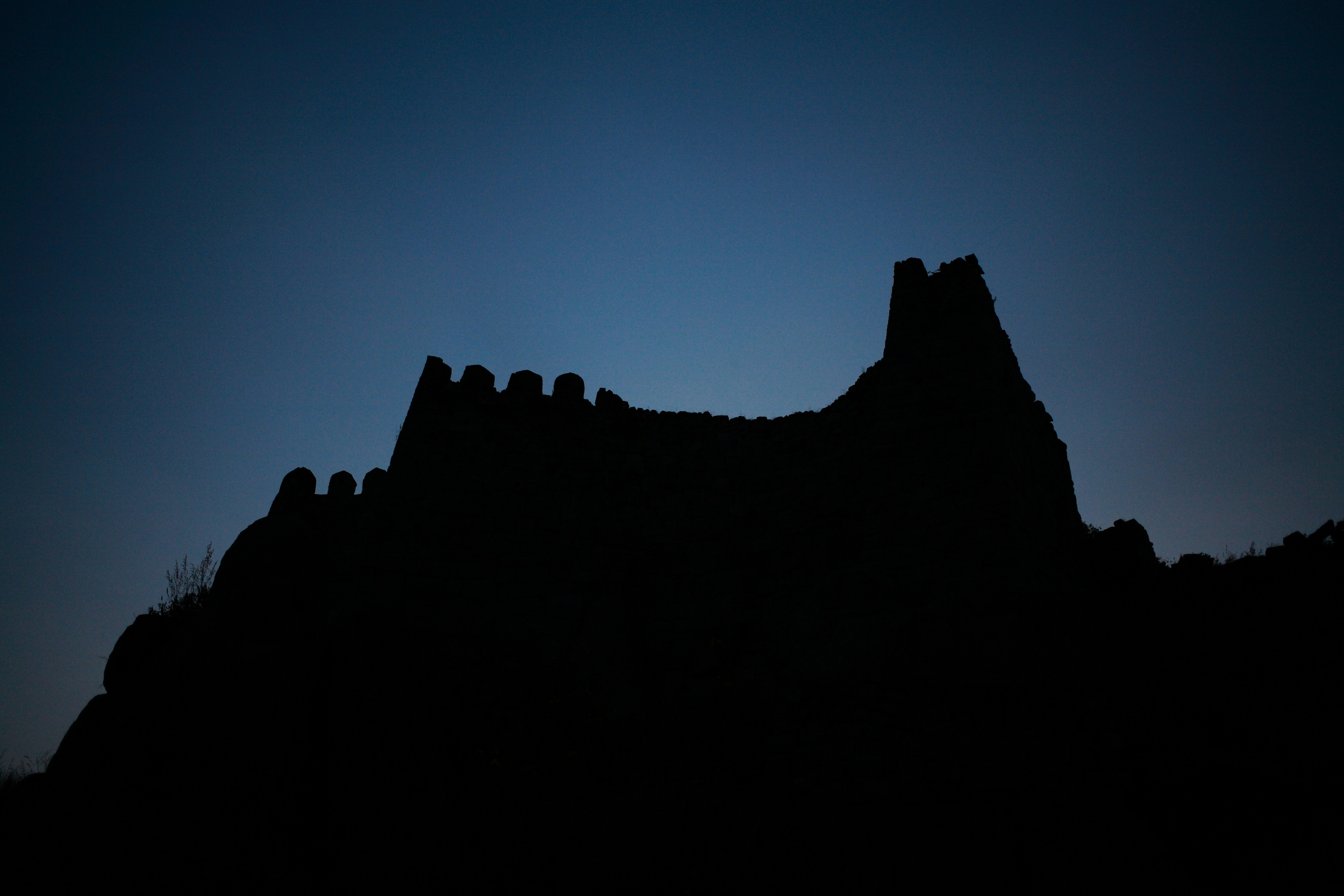 A silhouette of the majestic Golconda fort against the evening sky.