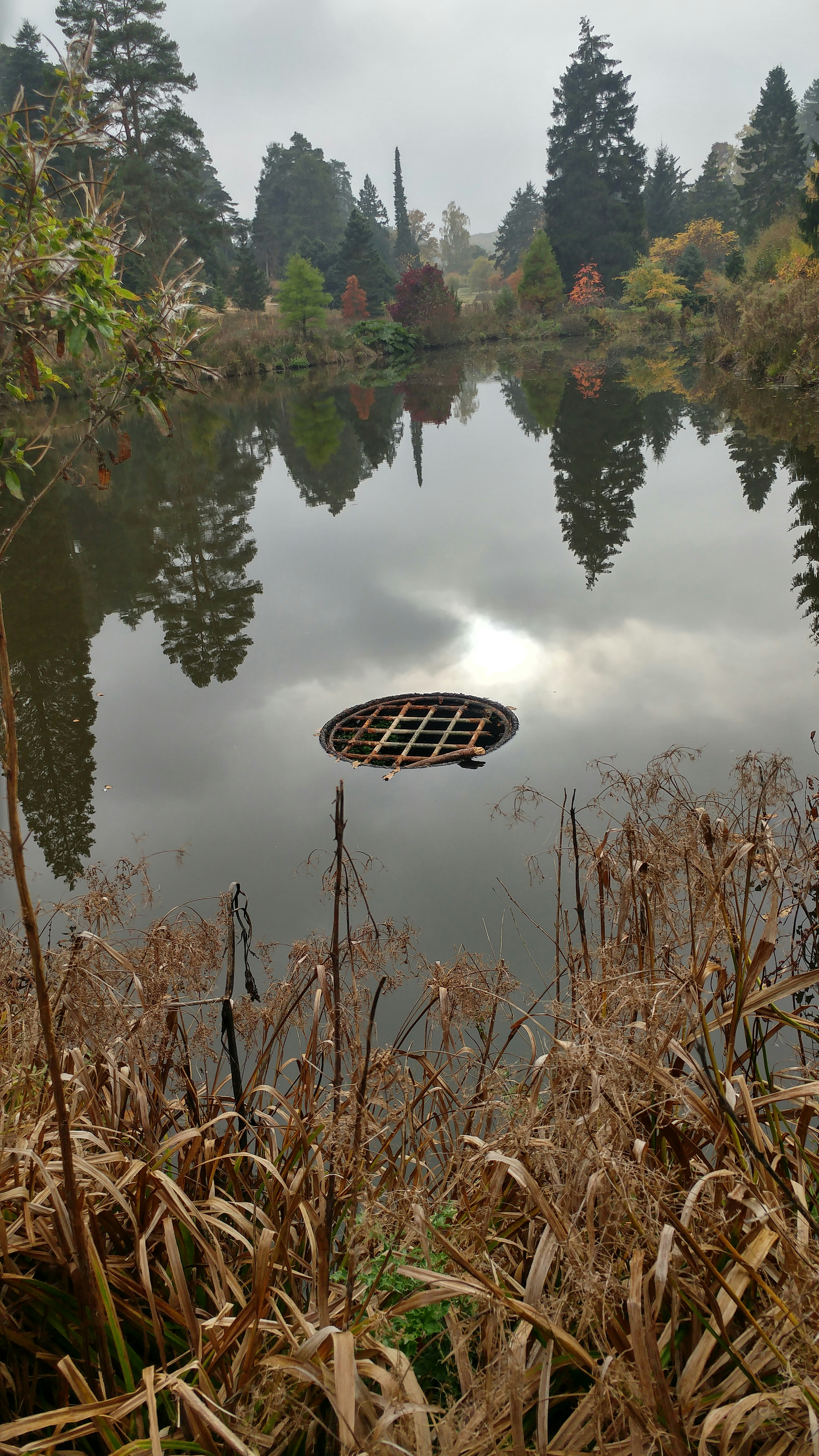 On a walk round Bedgebury Pinetum in Kent, we found this drain in a perfectly still lake.