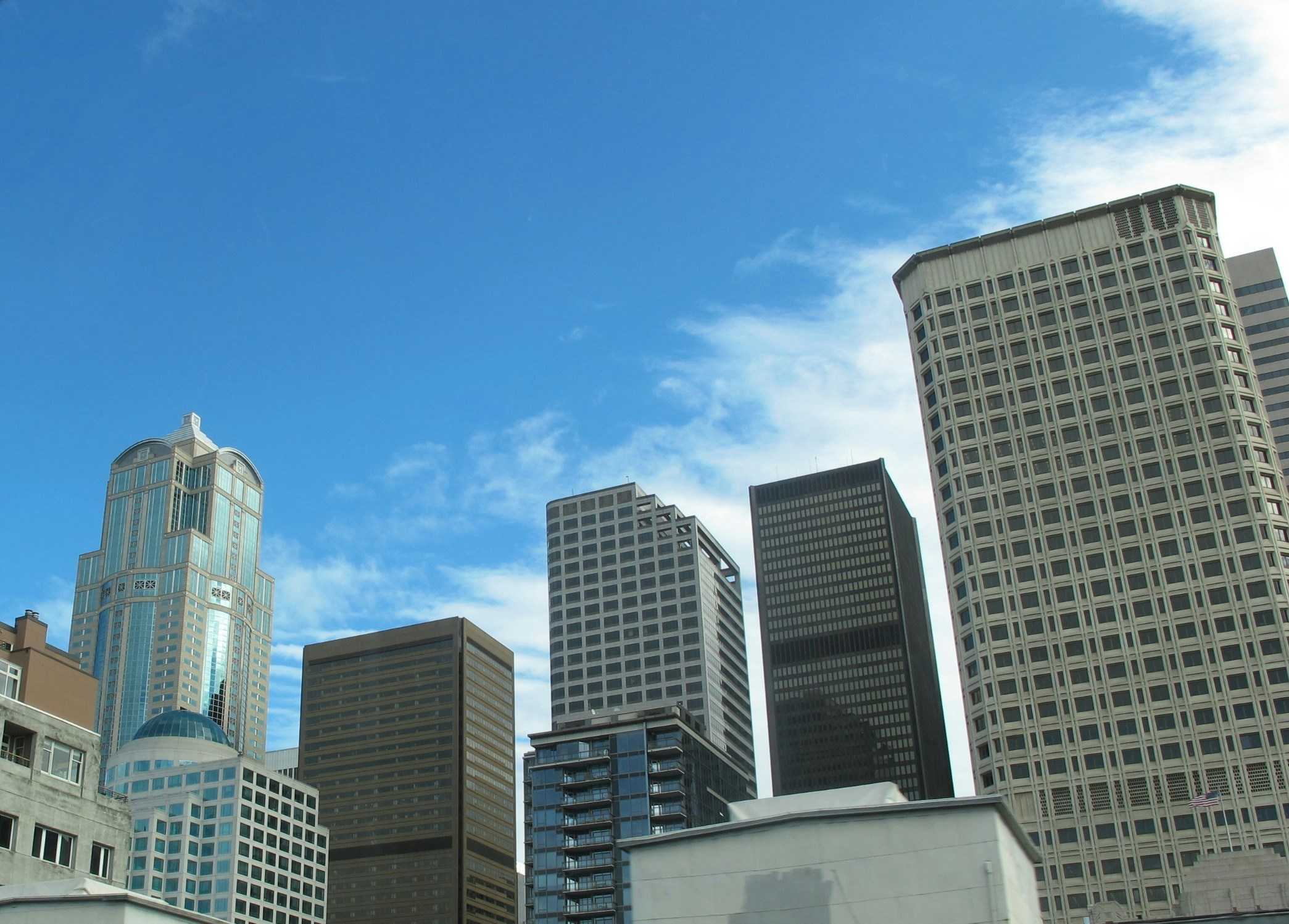 Blue sky enhances urban high-rises in downtown Seattle