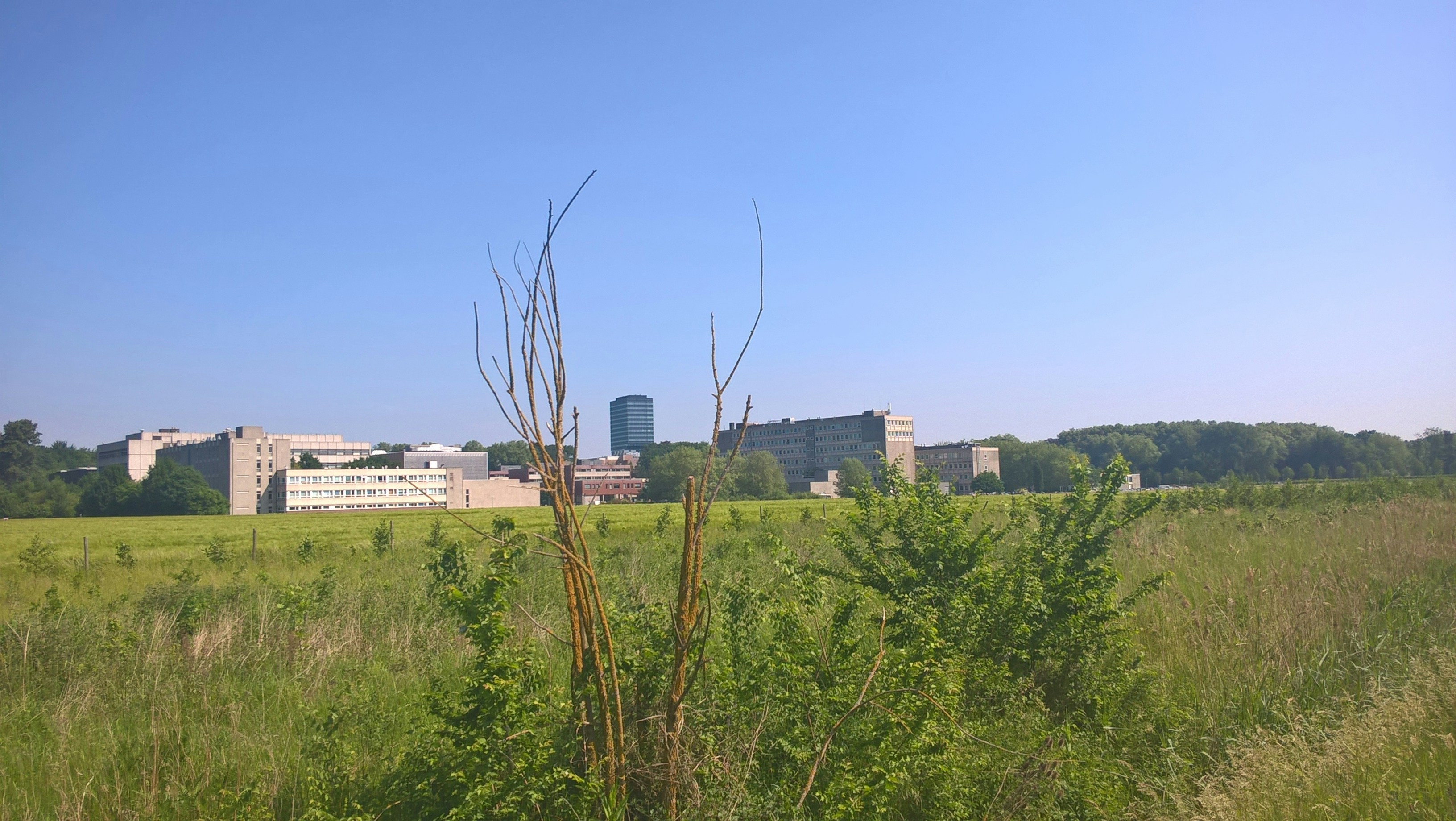 Leuven is a nice city in Belgium known for its university and university colleges. But the city also has a lot of greenery in and around it. This picture was taken just outside the city, with the hughest building of the city in the background.
