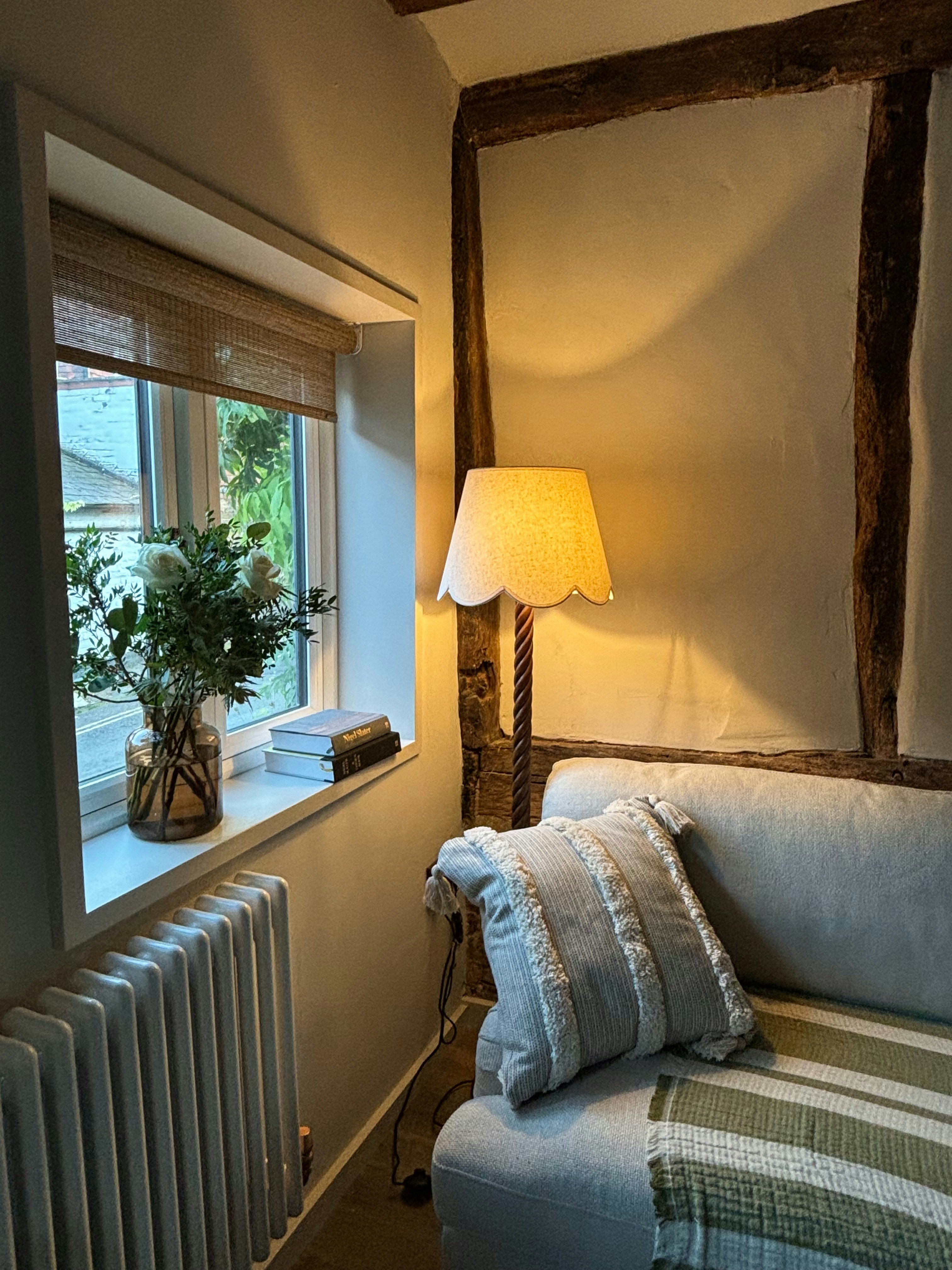 Rustic English cottage with wooden beams, cosy sofa and glowy lamplight