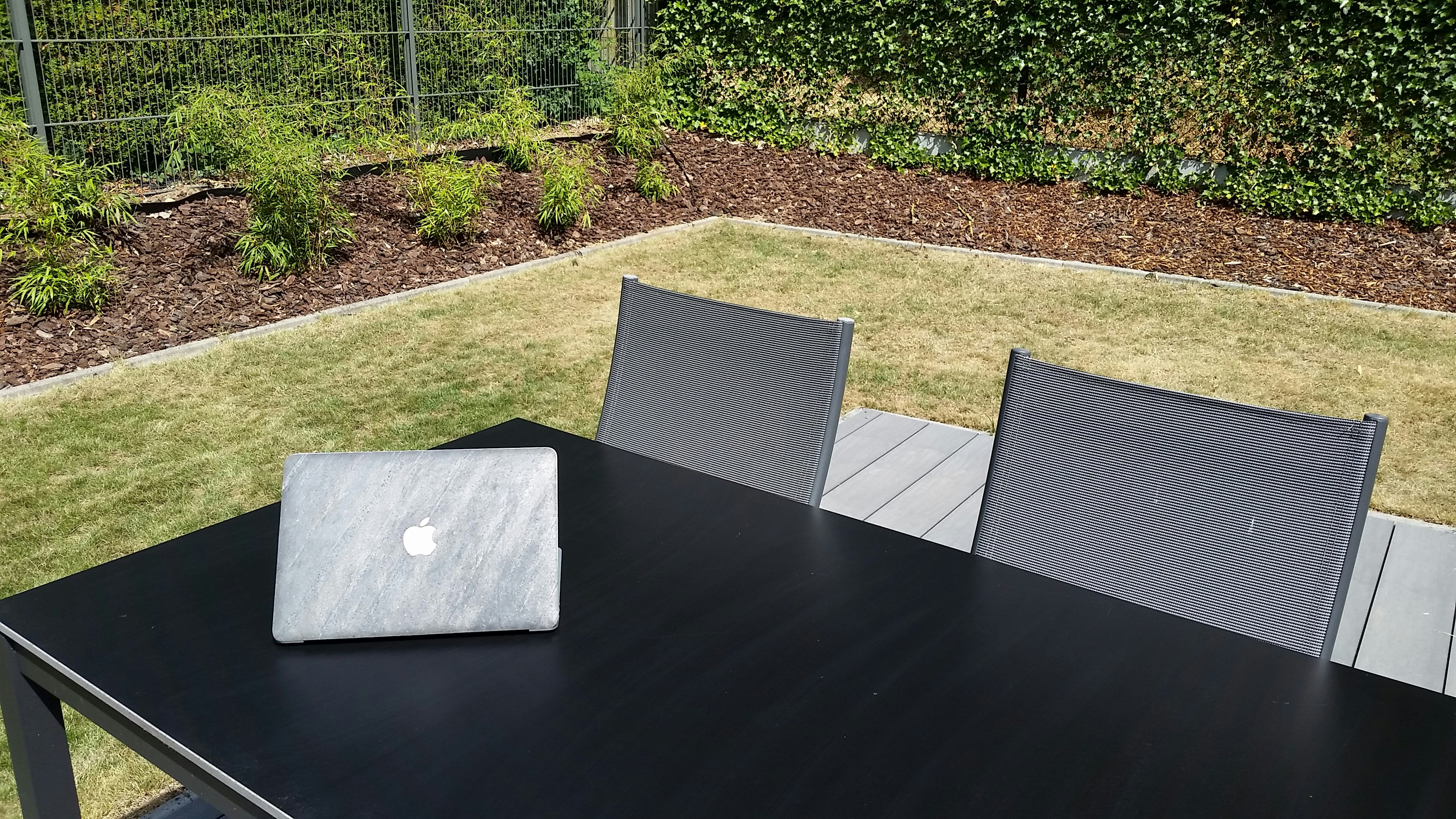 Macbook with Bambooti Stone cover on garden table