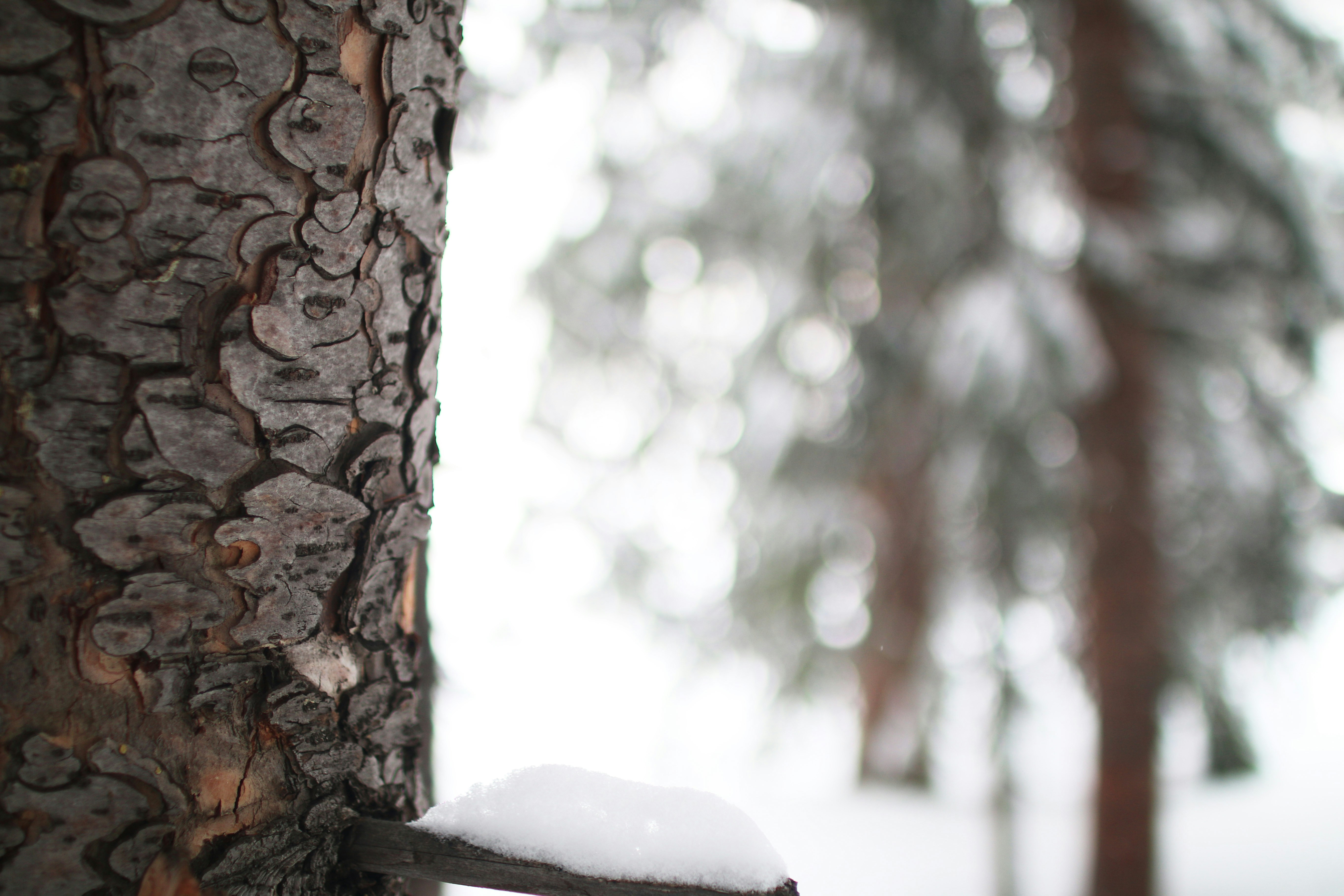 In the mountains of Utah, many of the trees grow a thick, resilient bark to protect against the harsh winters. The texture of the evergreen bark is beautiful, especially in contrast to the bright white surroundings.