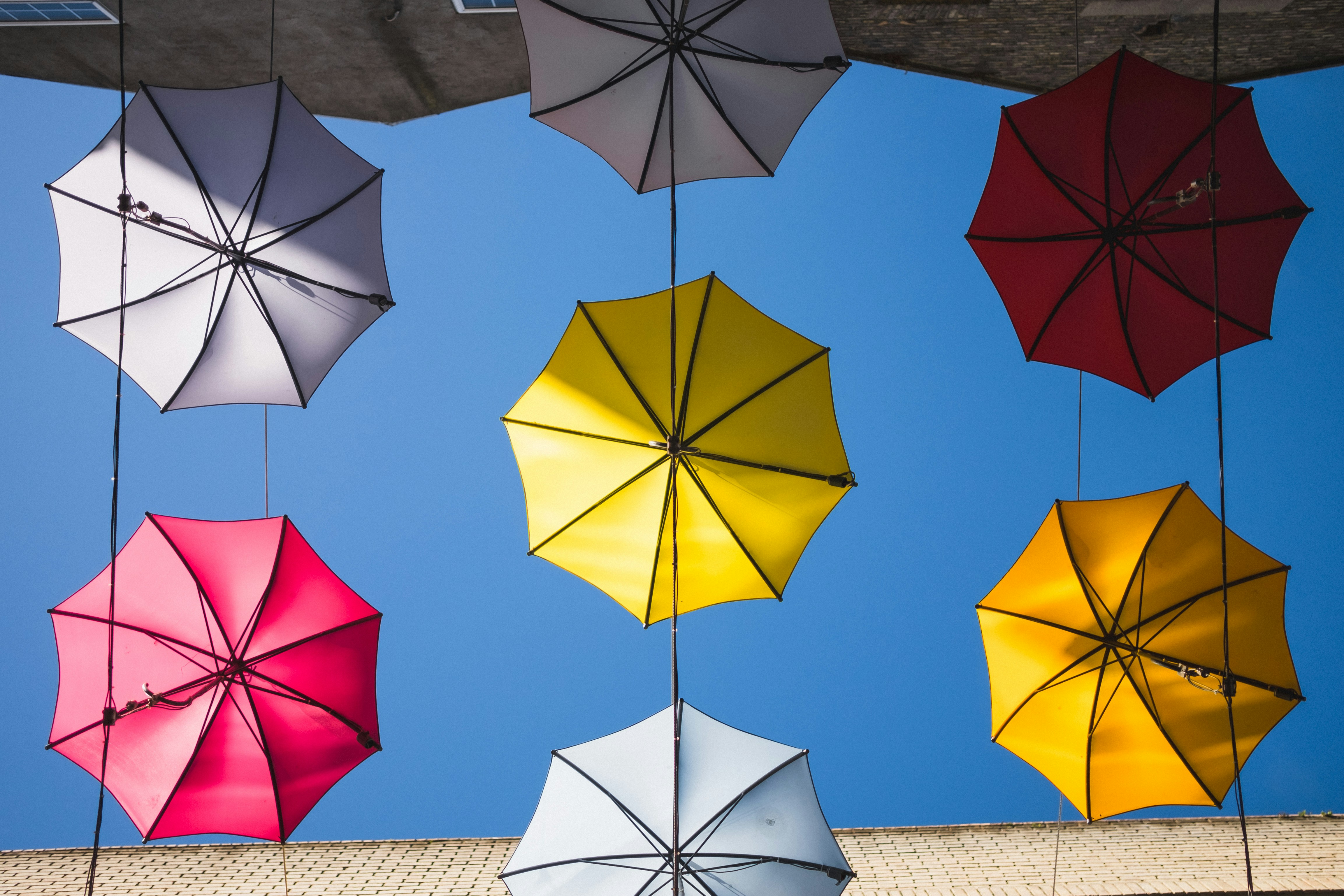An alley filled with umbrellas in Dublin, Ireland.