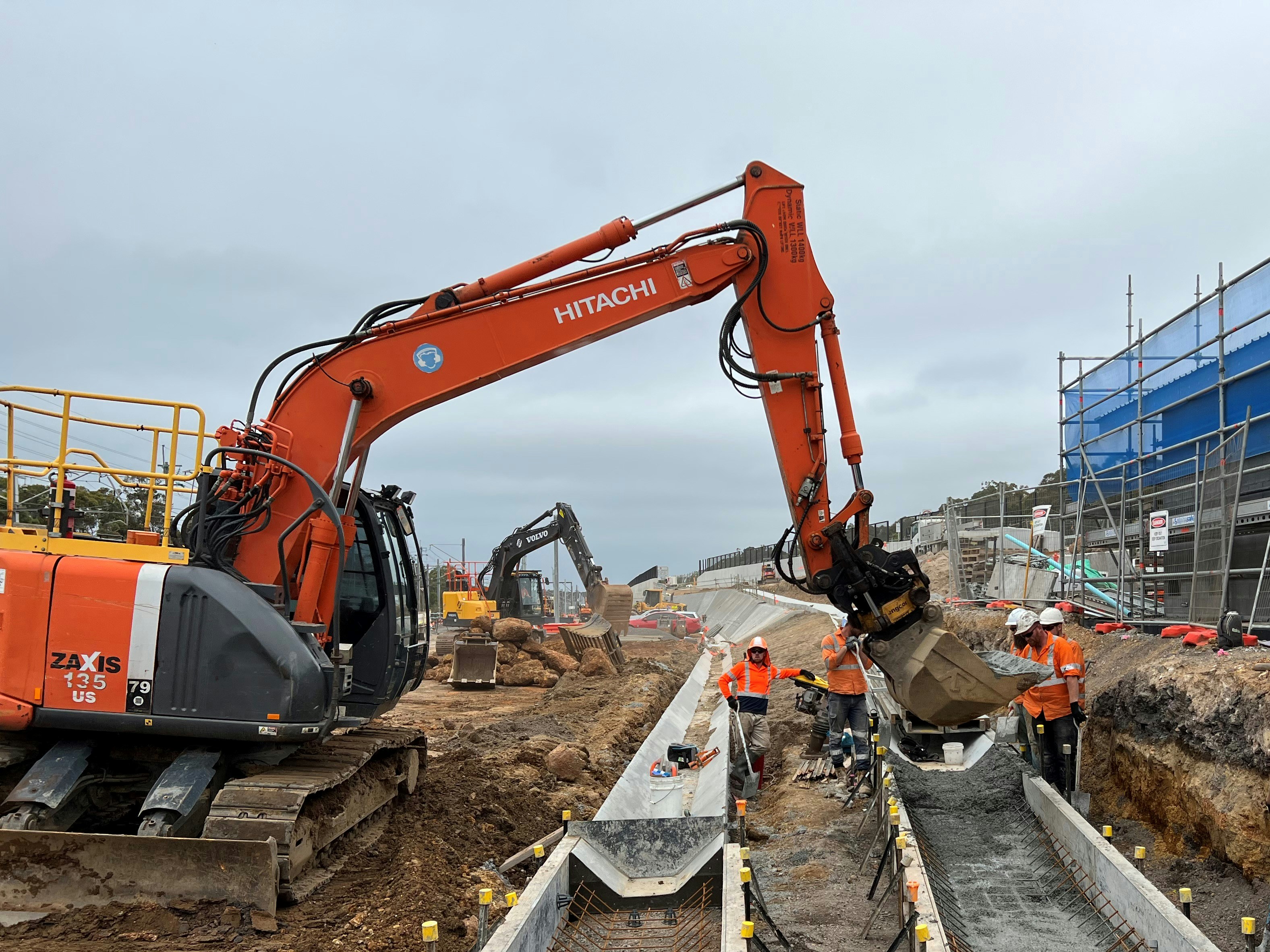 Excavator constructing a spoon drain