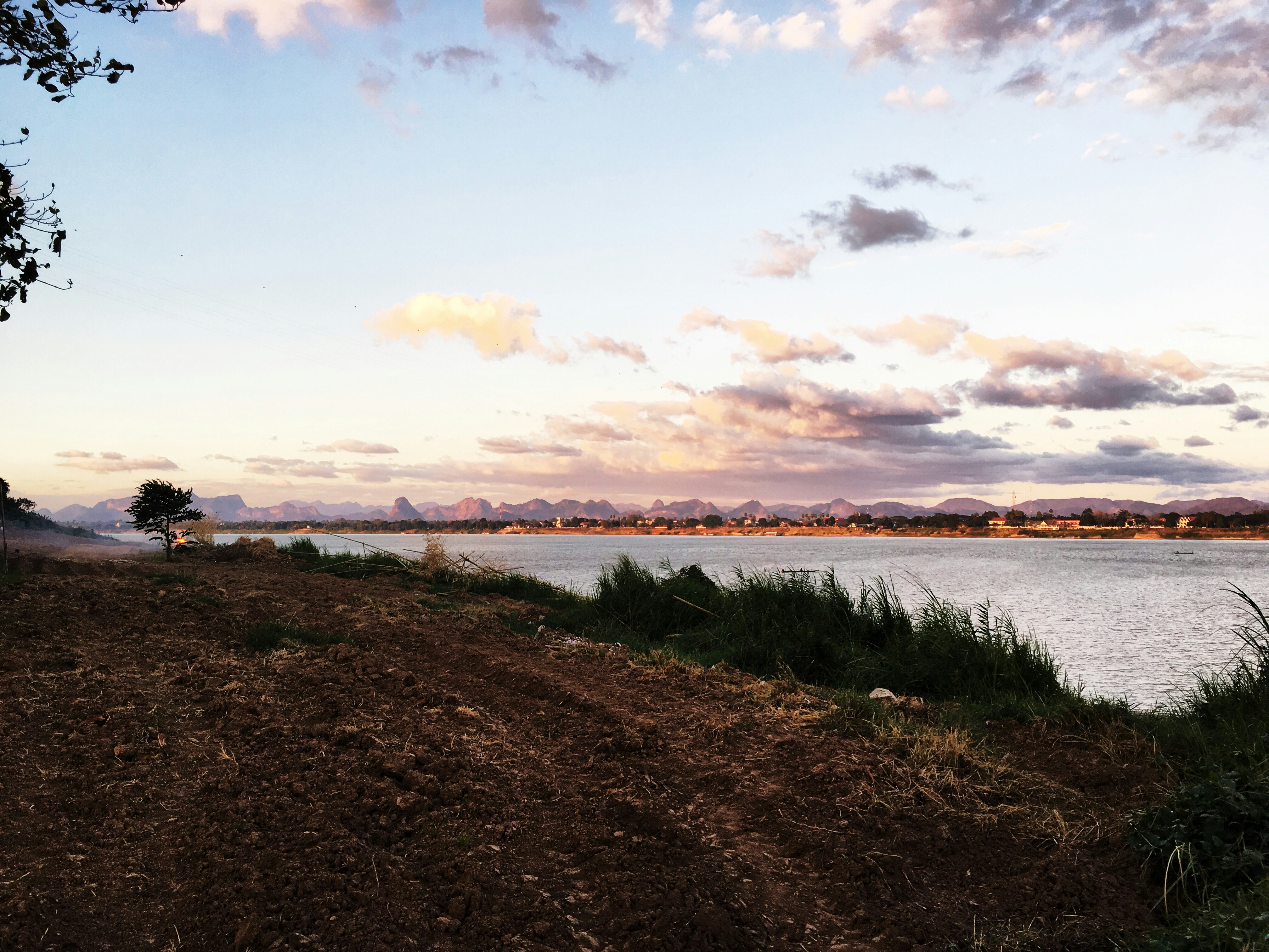 Standing in Thailand, looking over the Mekhong river at a mountain range in Laos.