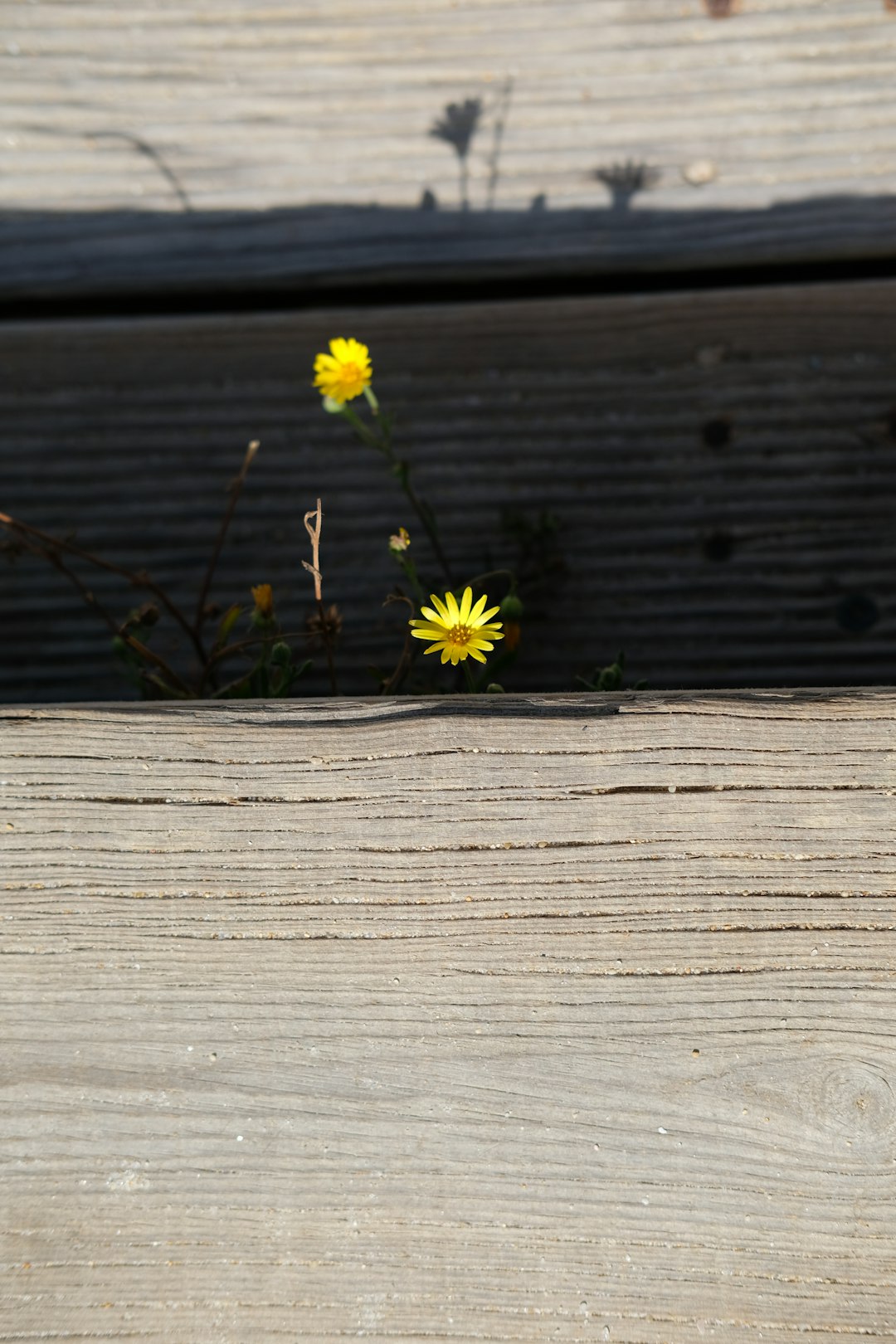 Morning walk to the beach, the little flowers lurk down the wooden stairs trying to catch some of the radiant light.