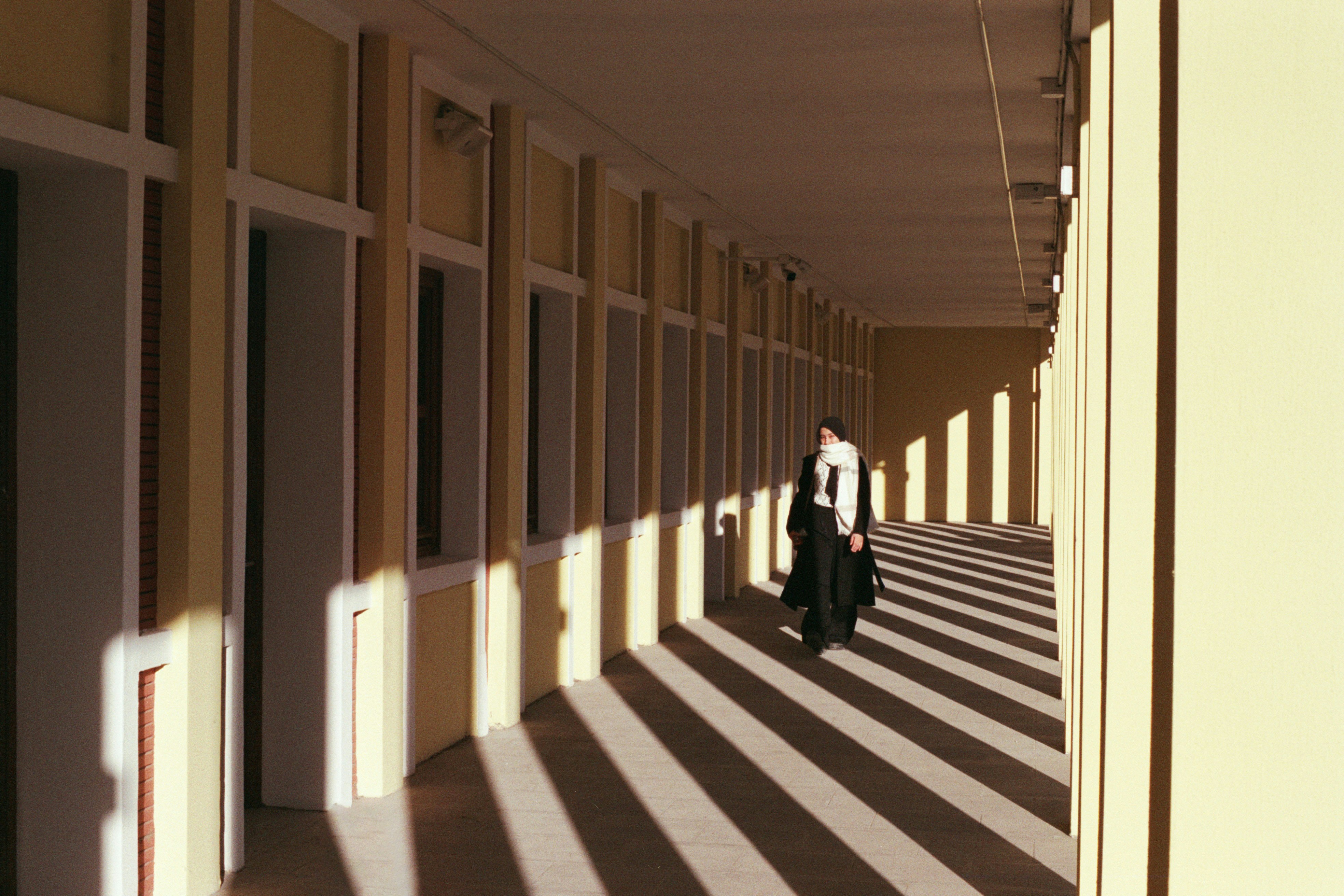 A woman walking with a leading line composition with strong shadow. Photo was shot on film (Lomography 100)