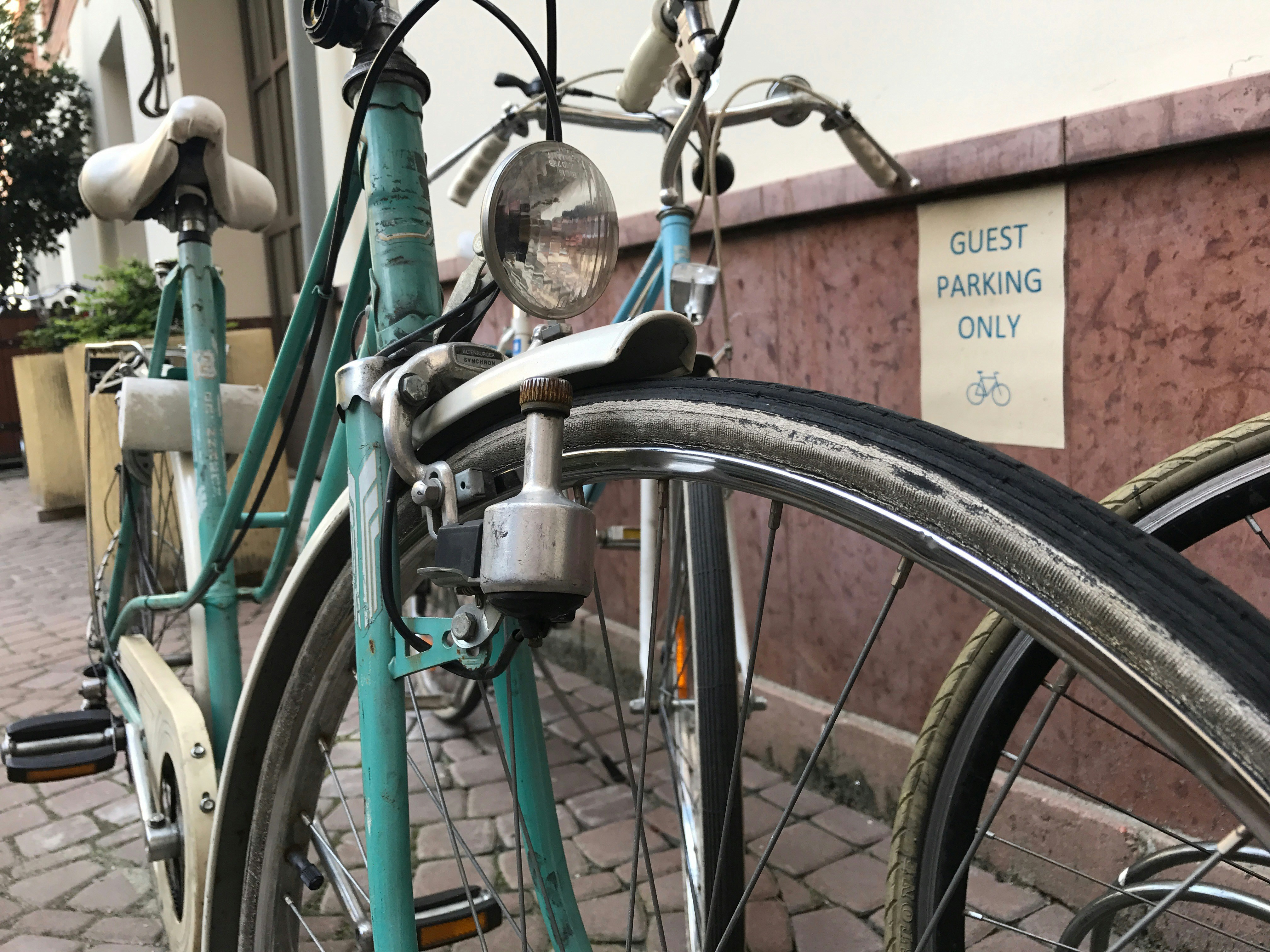 I was visiting the Prezi office in Budapest. In the building courtyard, there are guest parking spots for cyclists. I love this because I’m an American and a cyclist–in the states, guest parking is for cars, and cyclists are ignored. I also love the old-style bike with the dynamo-powered headlamp. The bike is a beautiful teal with white highlights–just gorgeous.