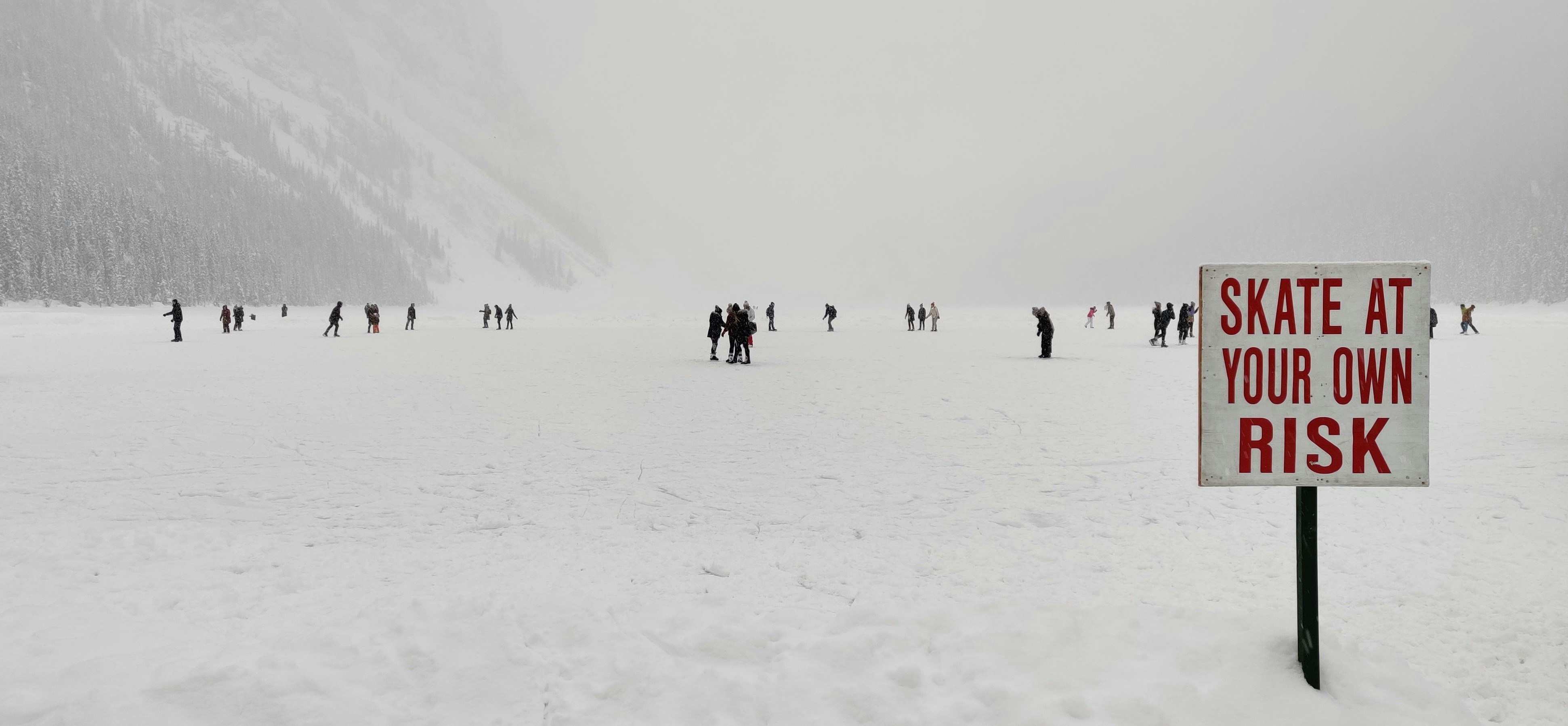 People skating at their own risk on a frozen Lake Louise in Canada.
