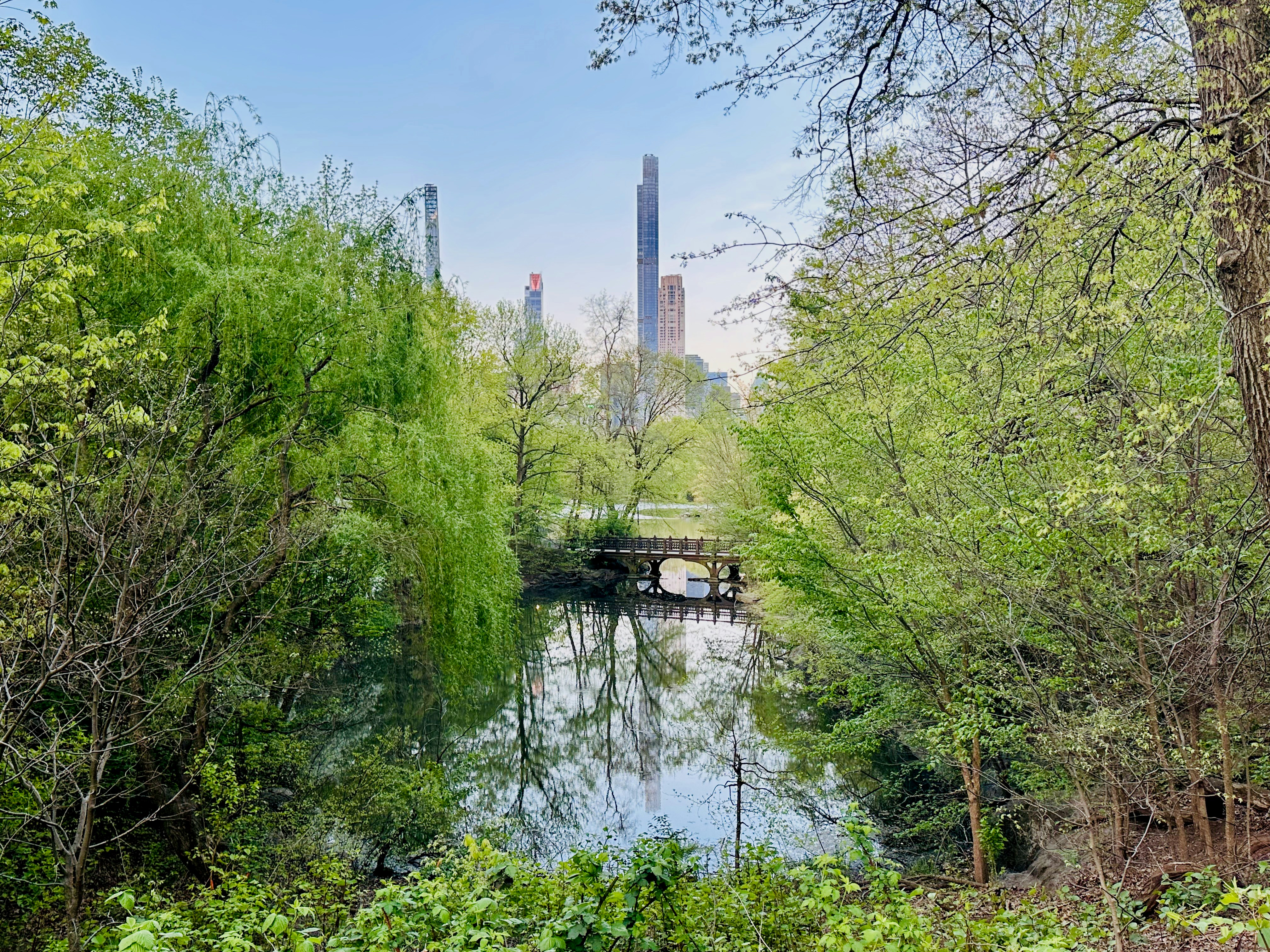 A view of The Lake at Central Park, shrouded by trees with the Manhattan skyline in the background