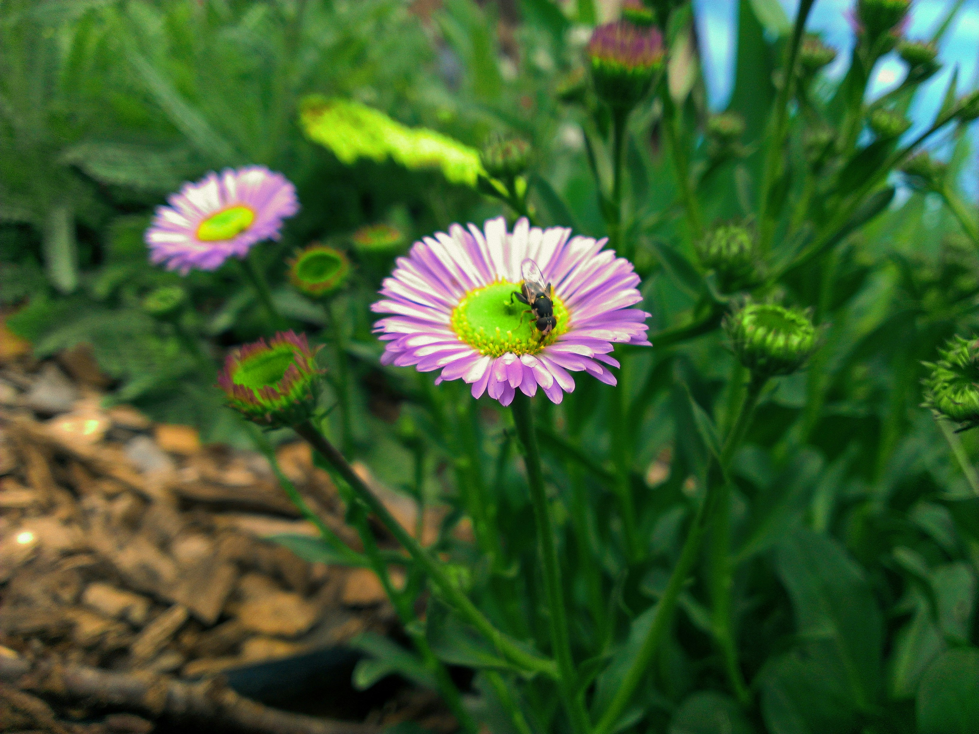 In the garden weeding, when I spied this not-a-bee hanging out on the native daisies. Turned out to be a Syrphid fly sipping nectar. No one thinks of flyies as pollinators, but looks like this one was doing the same job. I really hate flies, but now have a fondness for this little fellow.