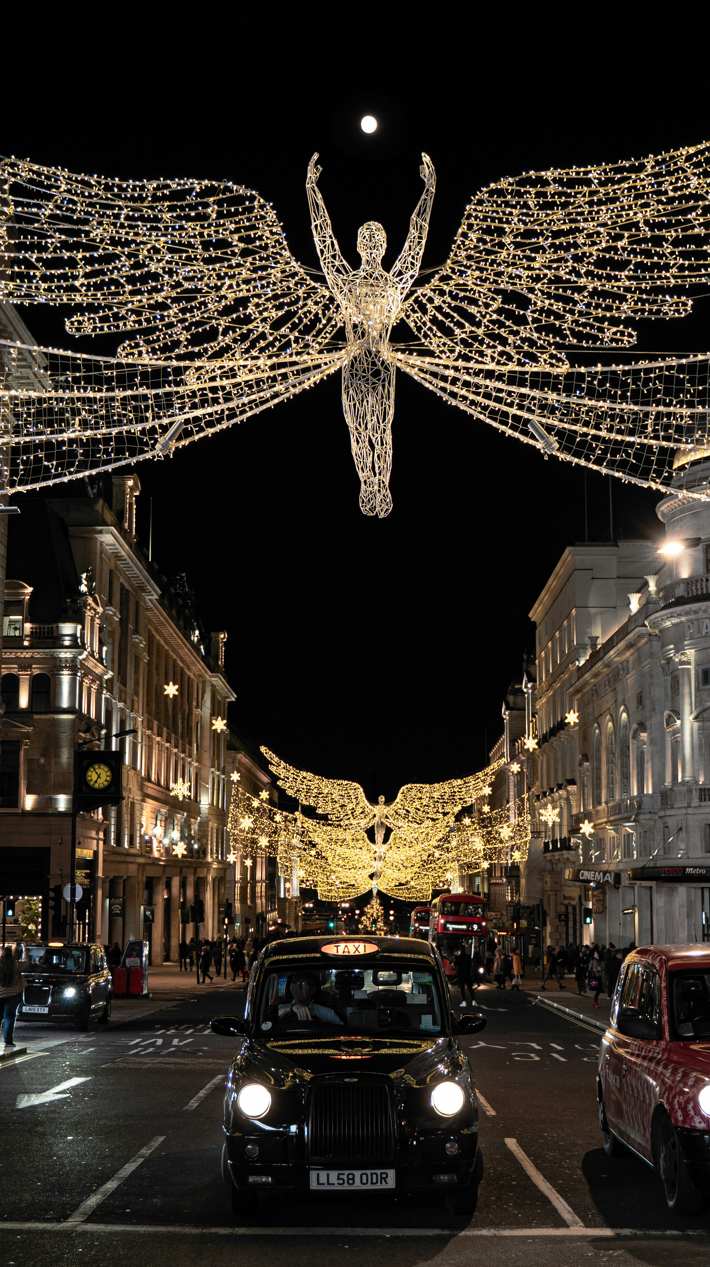Christmas light ( Angel ) at night on Regent Street London with a taxi
