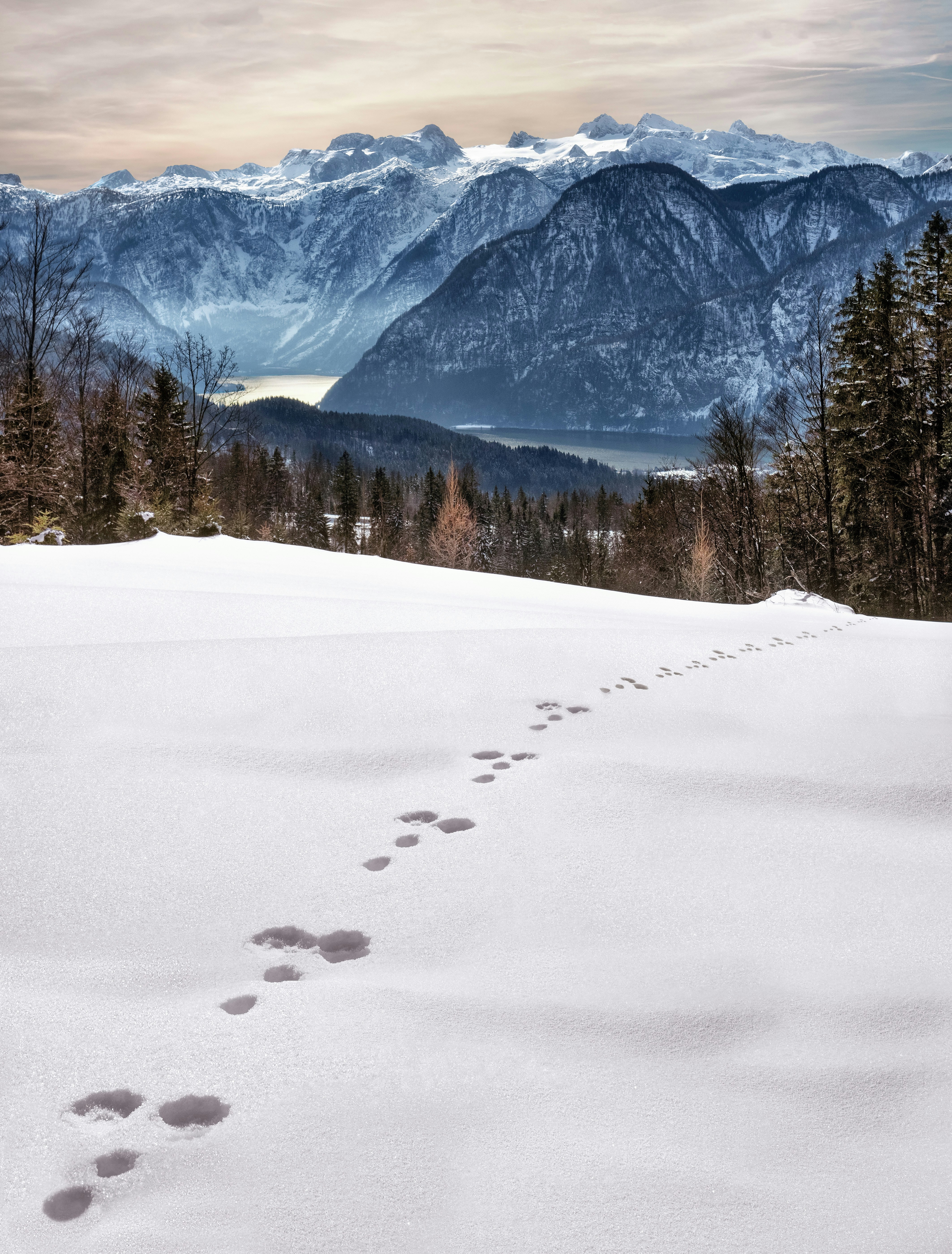 Silent winter day — Mr. Rabbit is on time In the distance the lake glows golden.