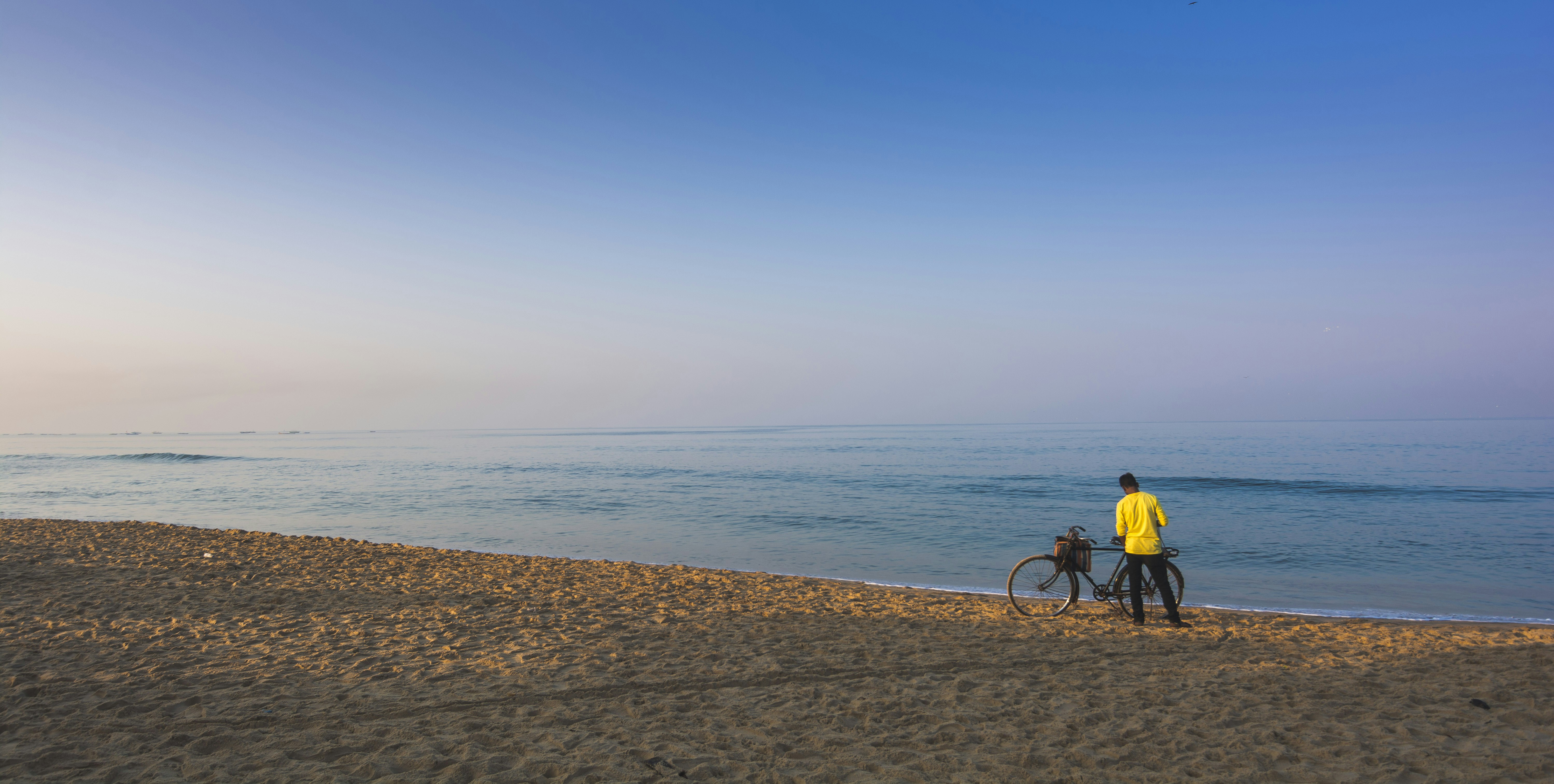 I clicked this Photograph in the early morning on Calungute Beach, Goa. It was just perfect frame with no people around the guy with his cycle who was selling tea. Also what stands out is the vibrant t-shirt that he was wearing.