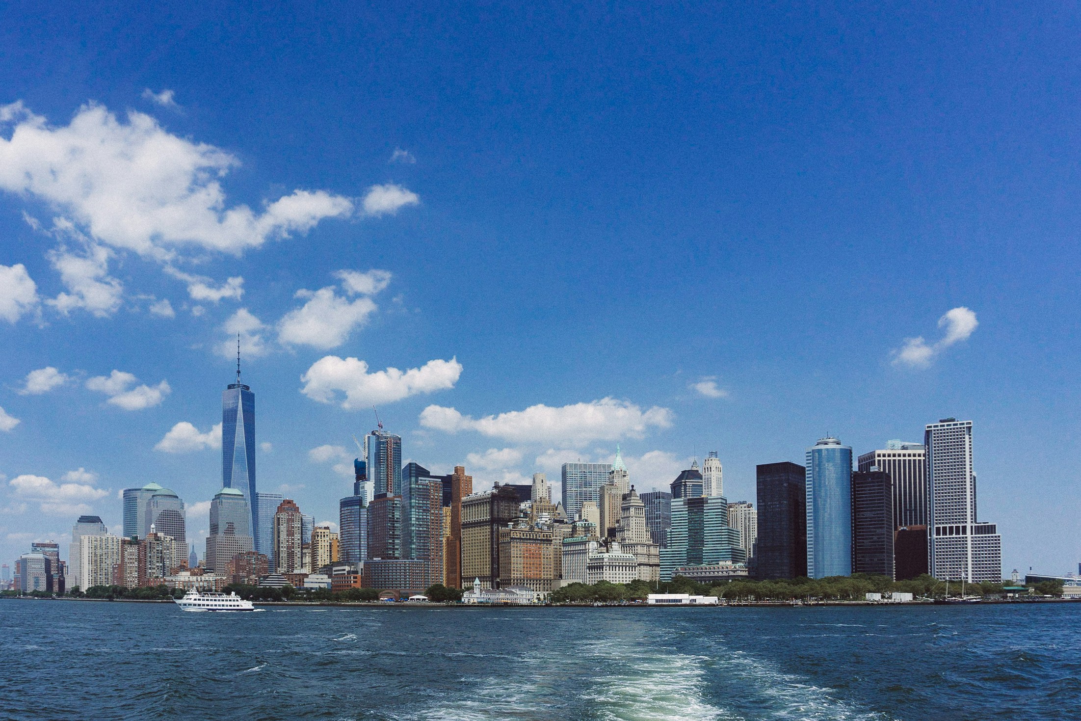 I took my daughter to New York to visit her aunt and cousins and had the opportunity to take her out to the Statue of Liberty. From the back of the ferry boat we snapped this picture on a beautiful afternoon leaving Battery Park.