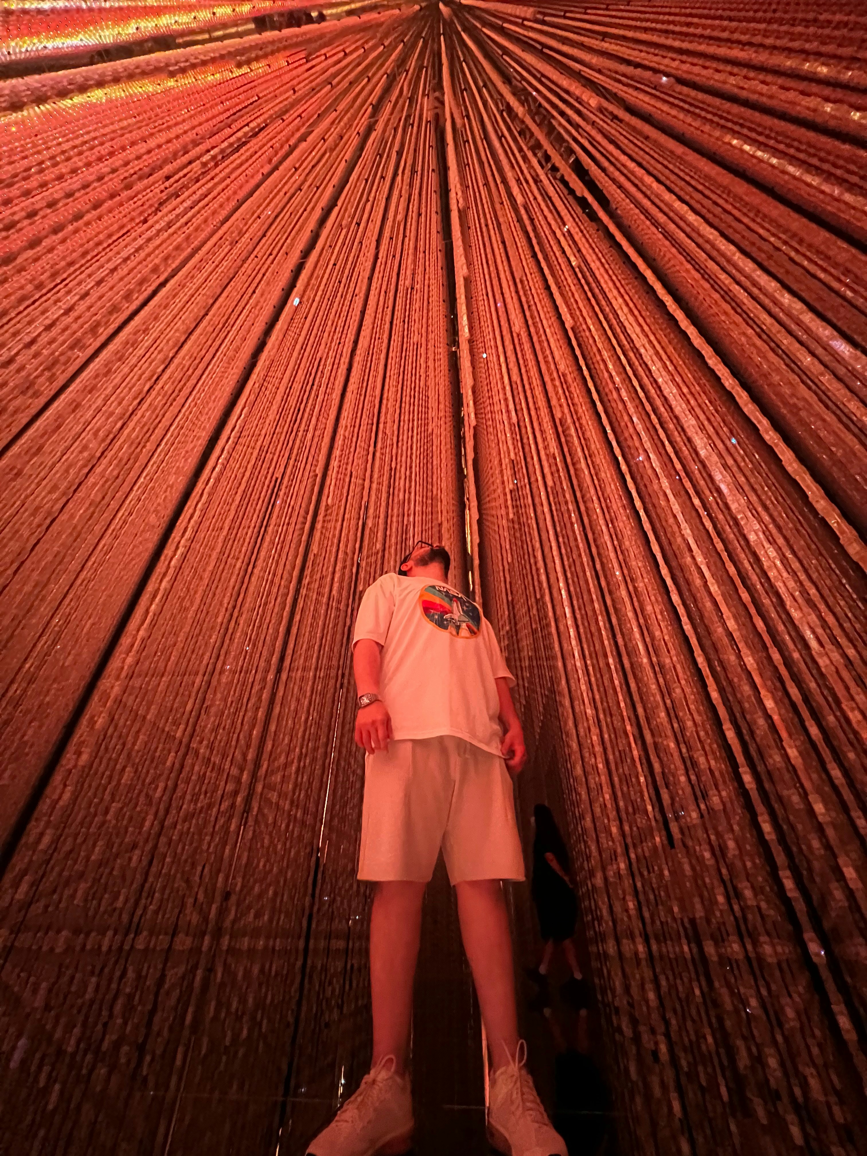 A powerful low-angle shot inside teamLab Borderless in Tokyo, Japan, capturing a person immersed in cascading strands of orange light. The mirrored floor and symmetrical glow create a surreal and deeply immersive digital art experience.