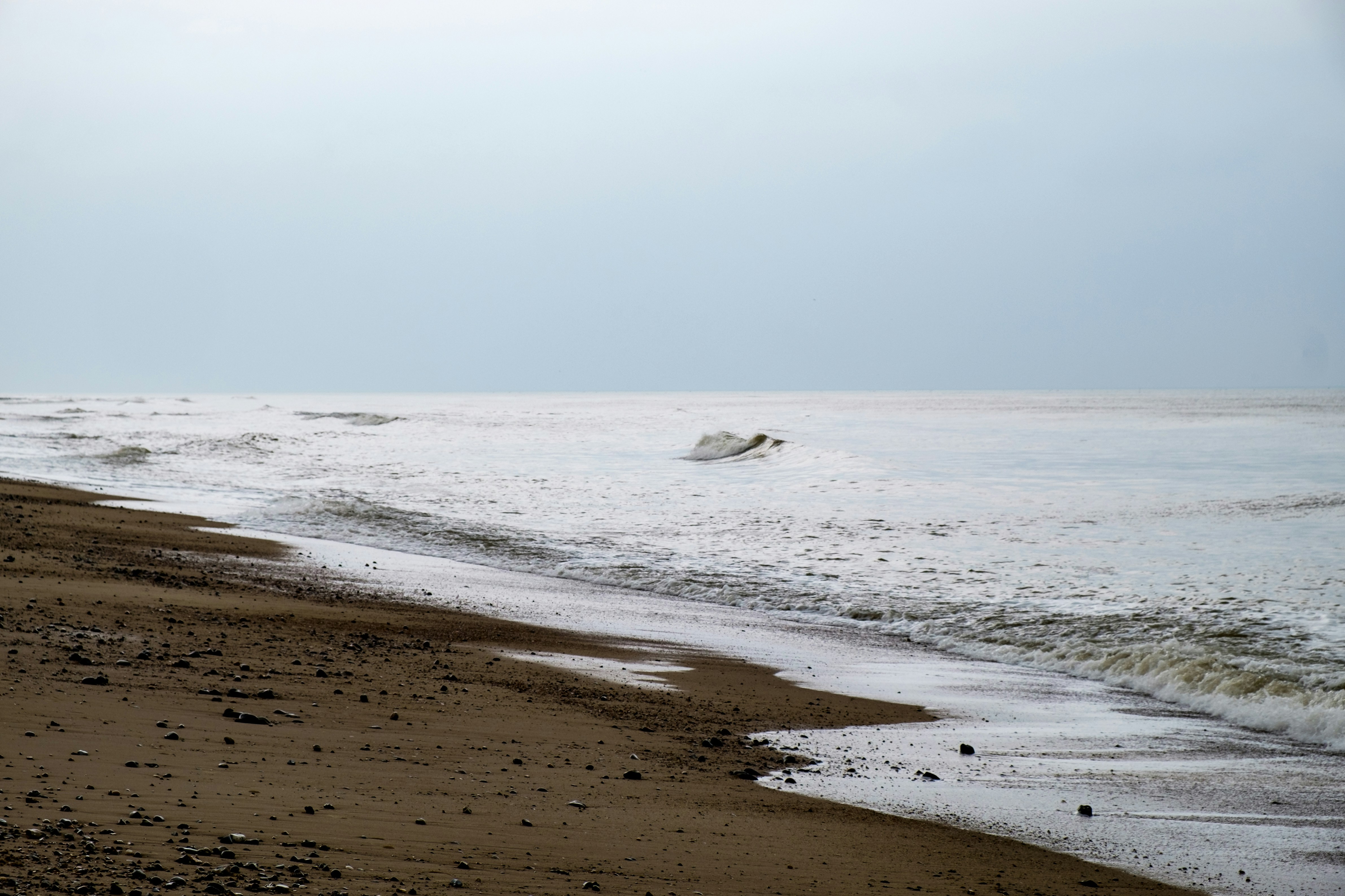 A diffused sunlight glinting on a calm sea, with a pale blue sky at the horizon. Calmness. A gentle breeze.