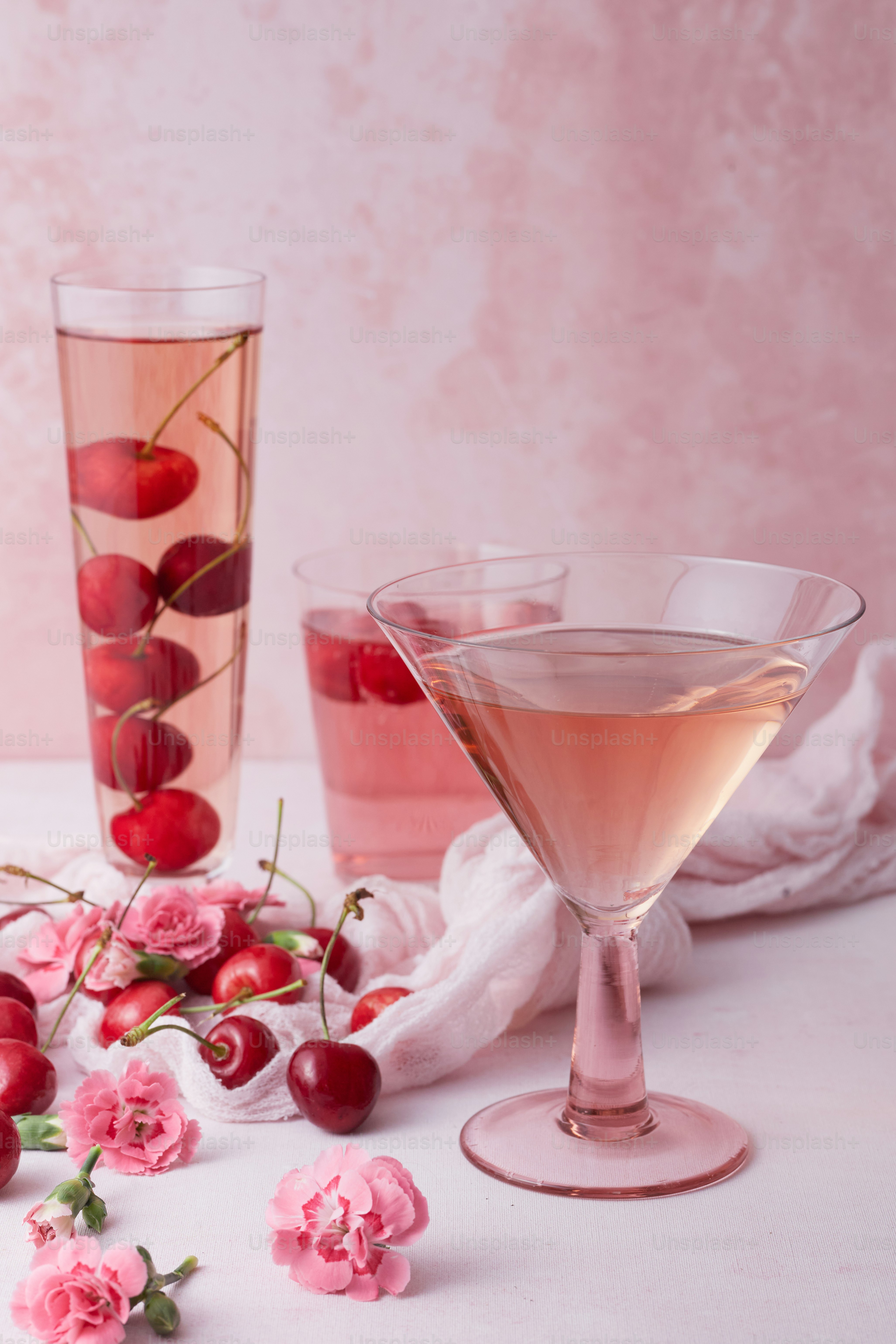Non alcoholic drink in glass on pink surface with cherries and pink flowers