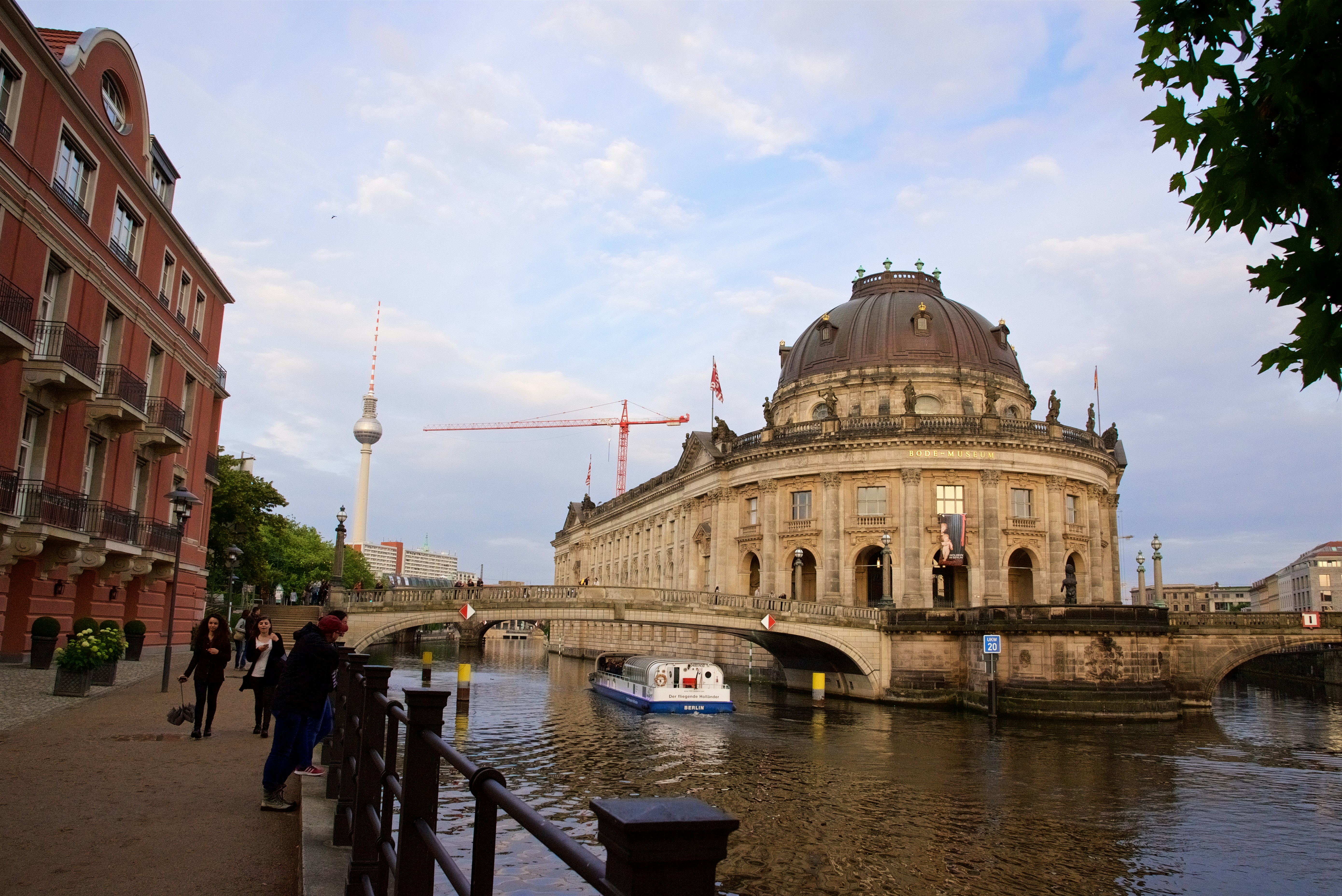 View of the Bode-Museum and Berlin in the evening hours along the Spree River.