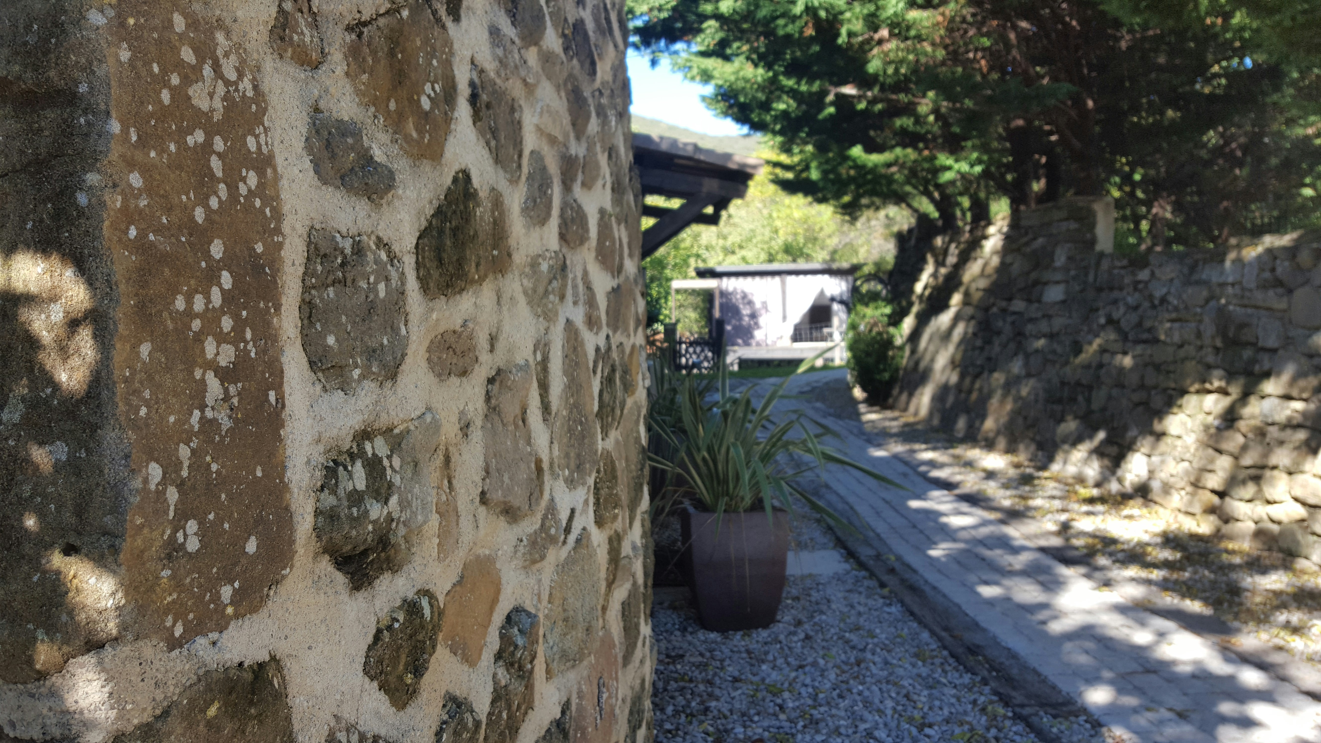 …short family vacation/business trip to the south of France. The sun was out it was beautiful and this pathway just look glorious with the sun beaming through and the trees creating shadows on the traditional French stone walls and pathway.