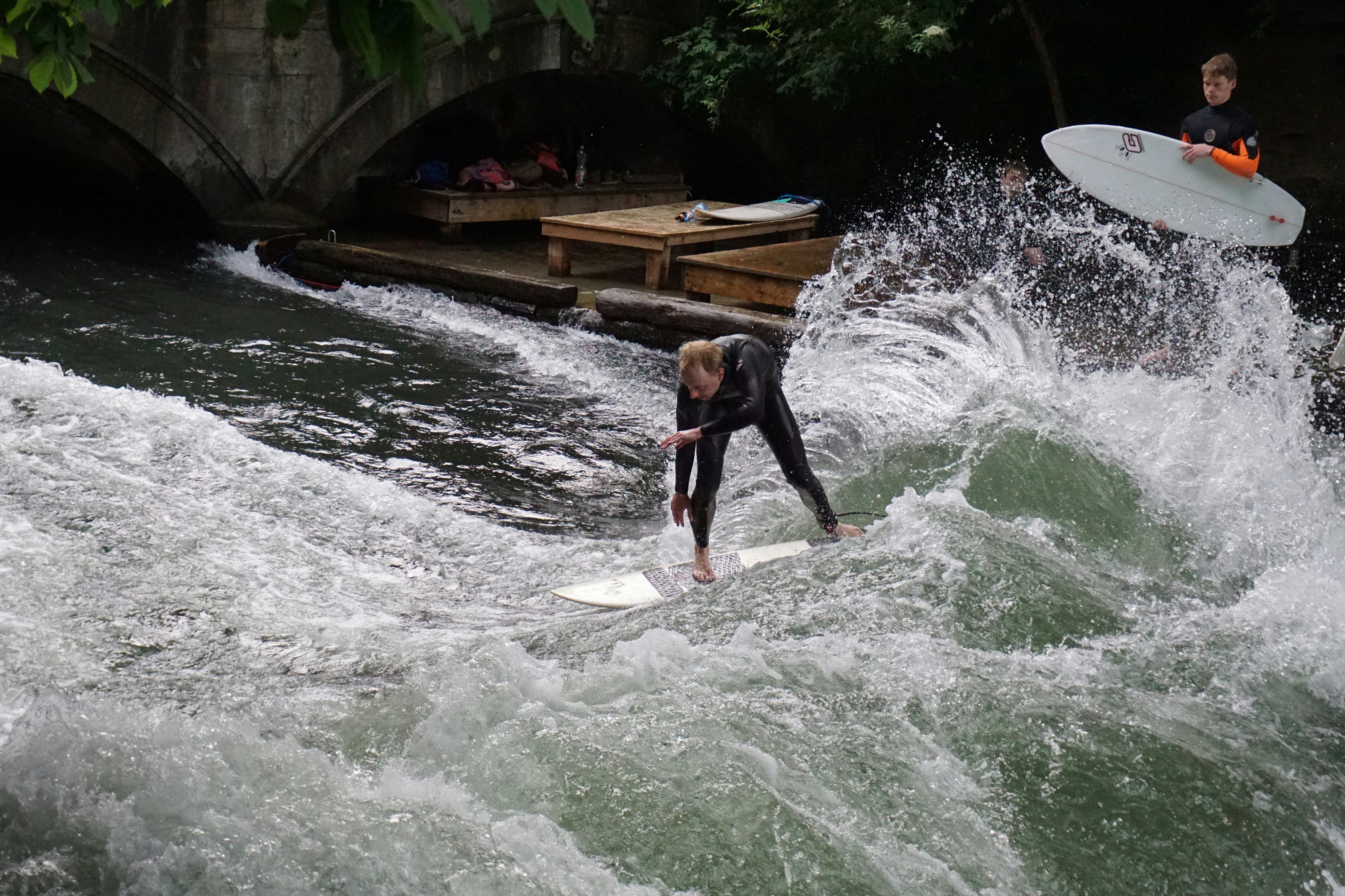 We were on a biking tour of Munich and our tour guide said that he wanted to show us something special. In Munich’s central park, people will surf in the Eisbach (the name of the beautiful man made canal that flows through the park). This became really popular when Munich hosted the summer olympics, but became illegal for a time because some people got hurt doing it. After the Keep Surfing Munich petition garnered more than 100,000 signatures, surfing here was made legal again (and liability is now protected under Germany’s “common sense” law).