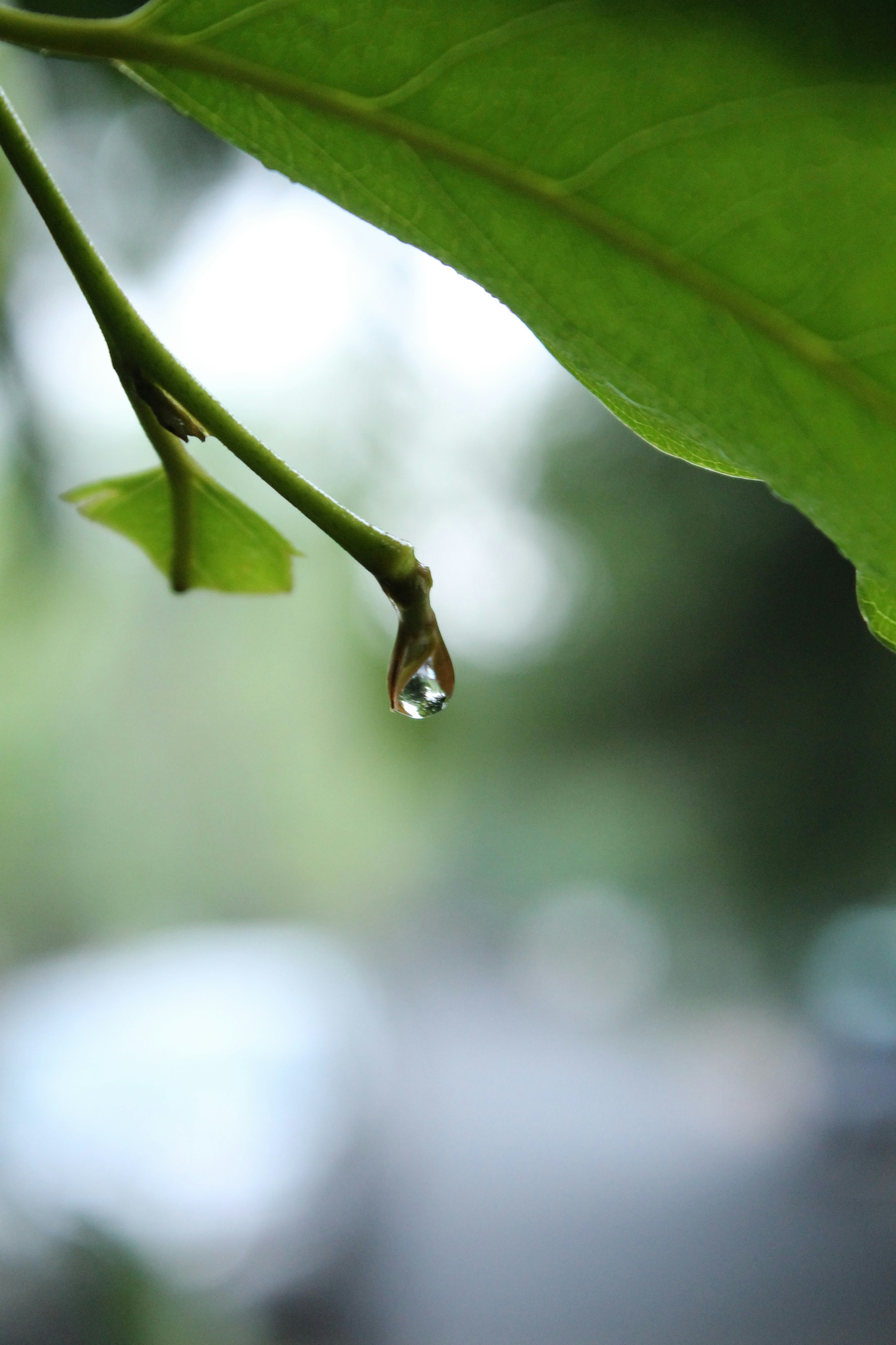 Captured during a casual stroll post rains in New Delhi, India. The photo has a very calming feel and shows the beauty of a drop clinging to a twig