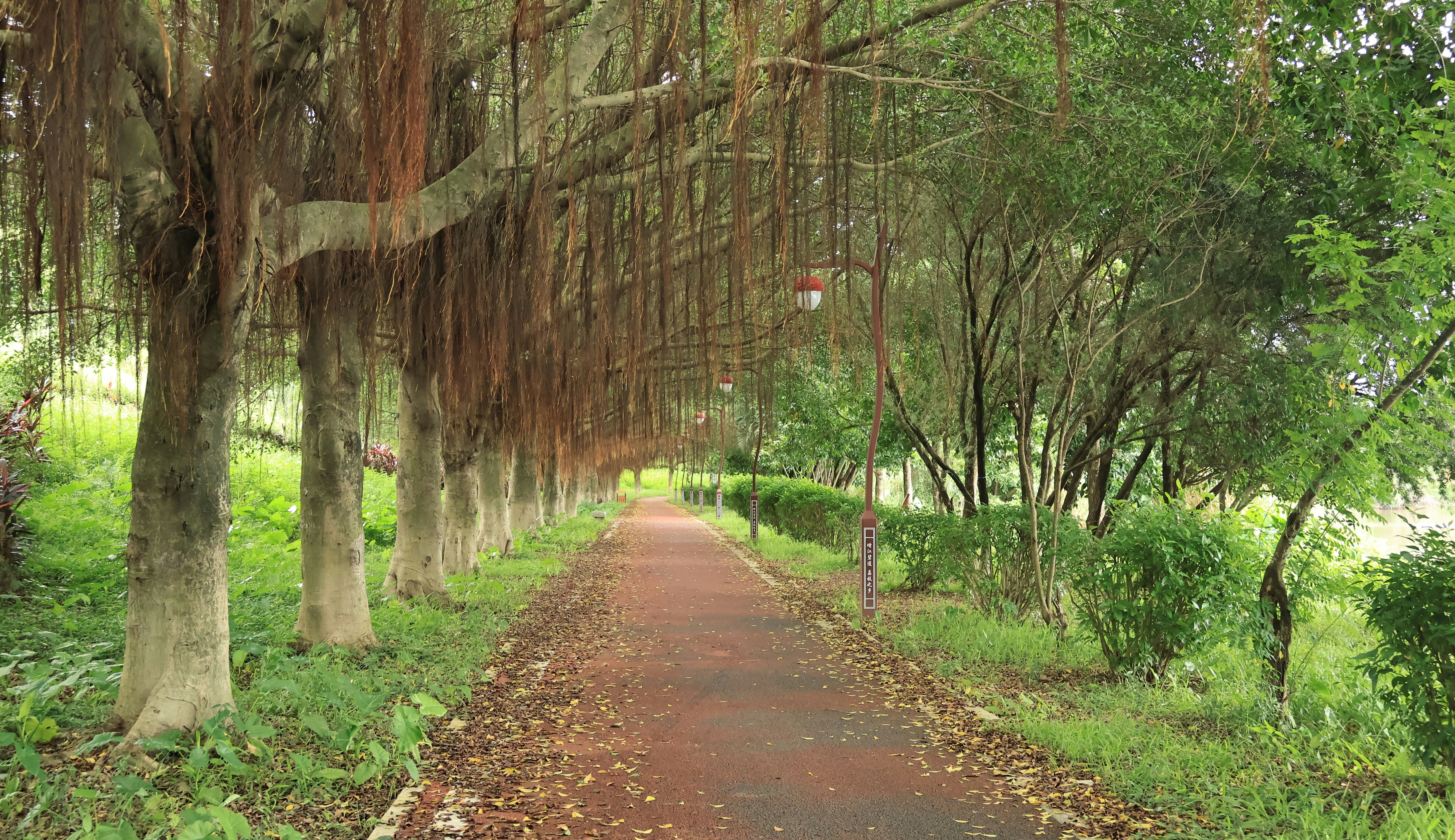 A treelined jogging track.