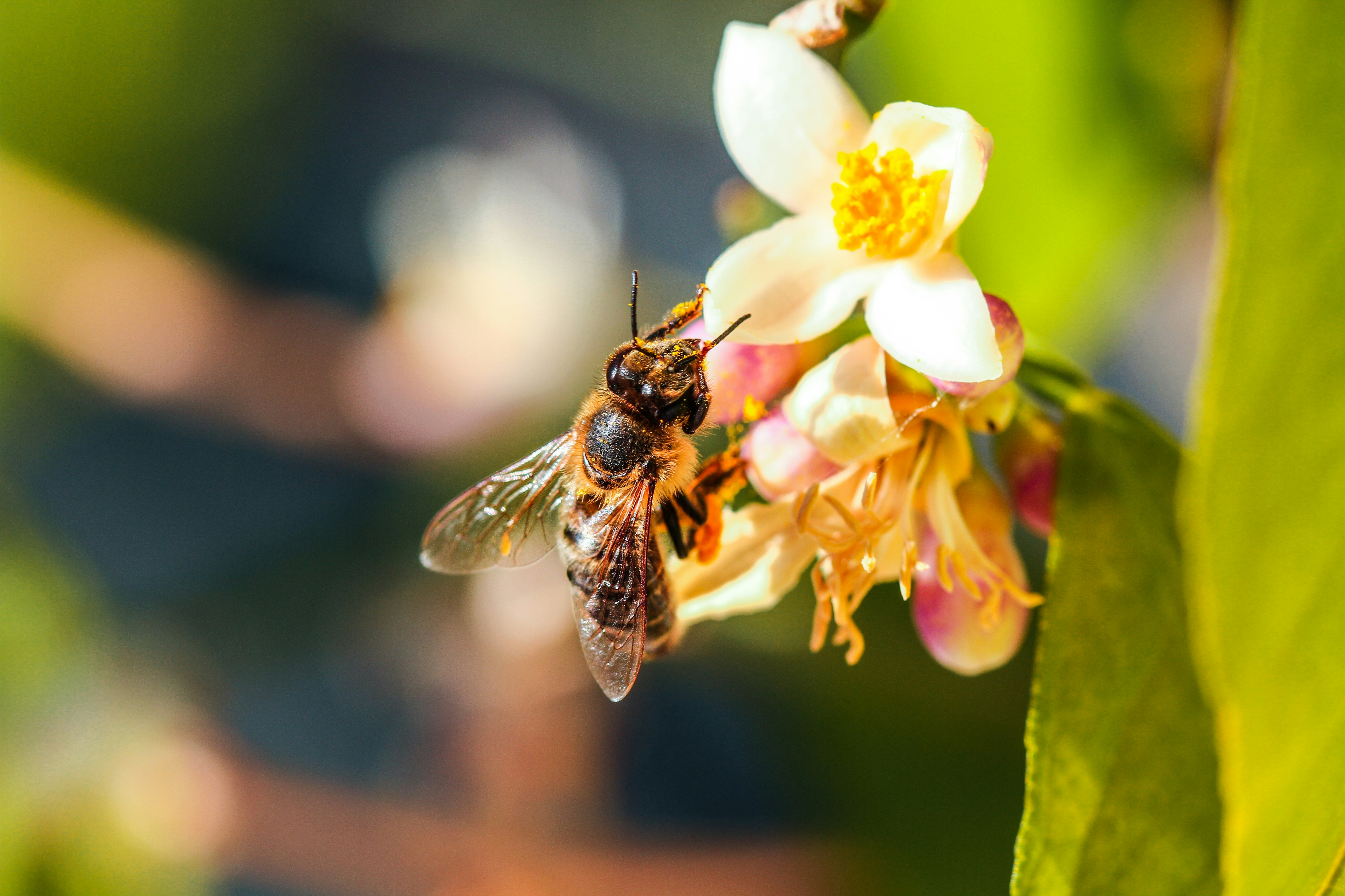 european honey bee sitting on a lemon tree blossom