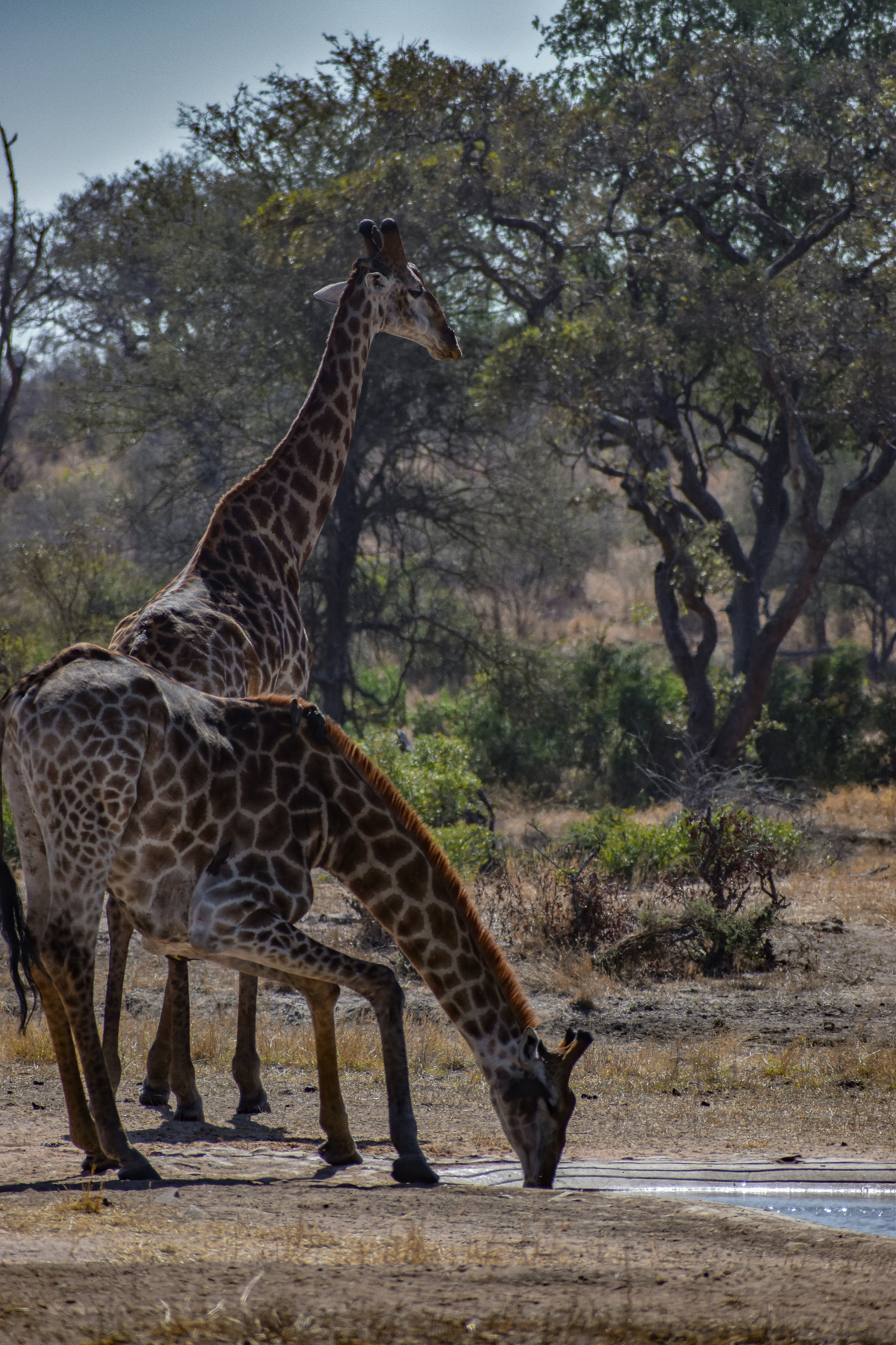 Giraffes drinking water. Shot in the Kruger National Park, South Africa.