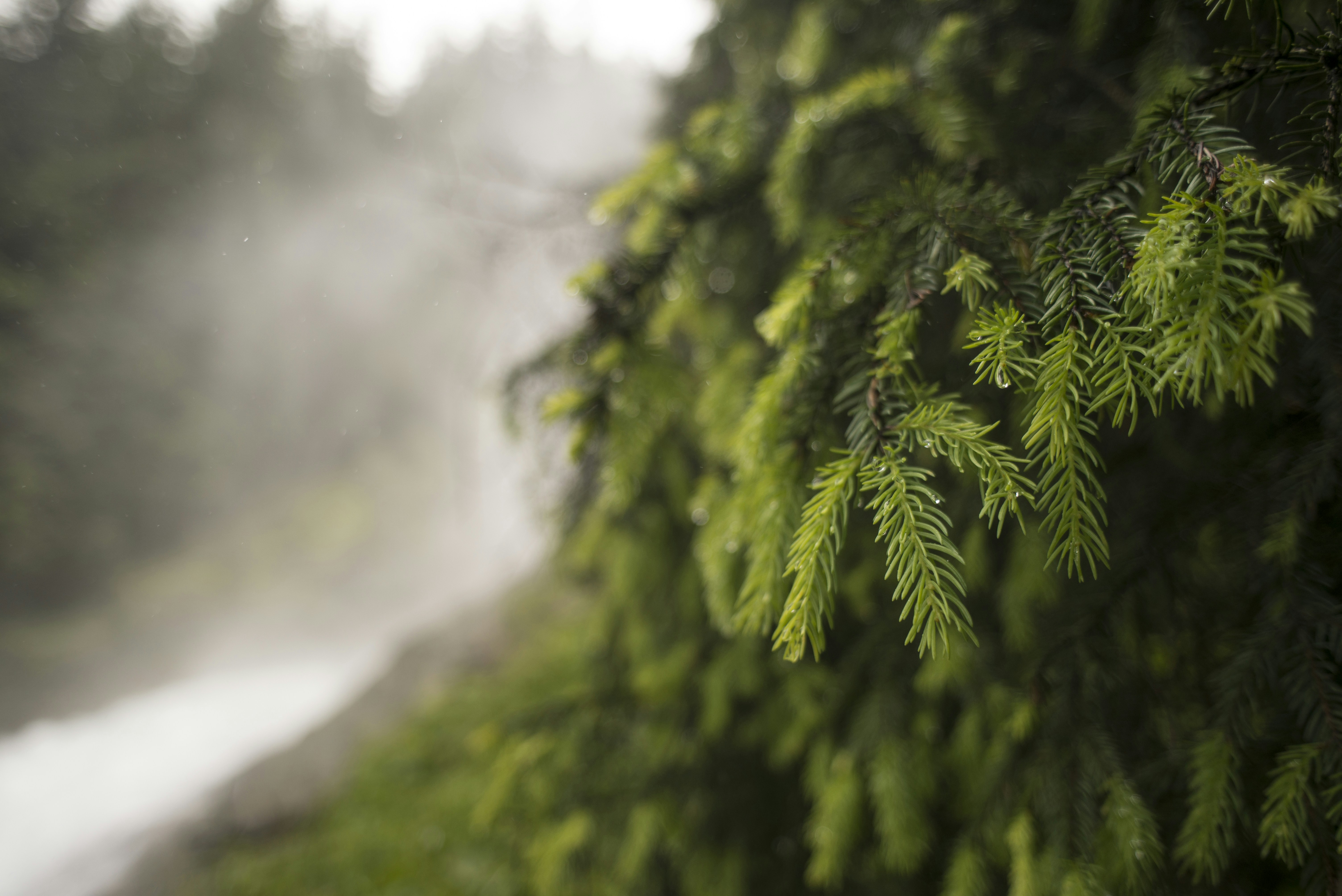 Hiking the trail to the top of the falls, stopped to reflect by a green fir as the rushing spray floated past. The crushing rumble reverberated in my chest, the crisp water graced my presence. It felt good to be alone.